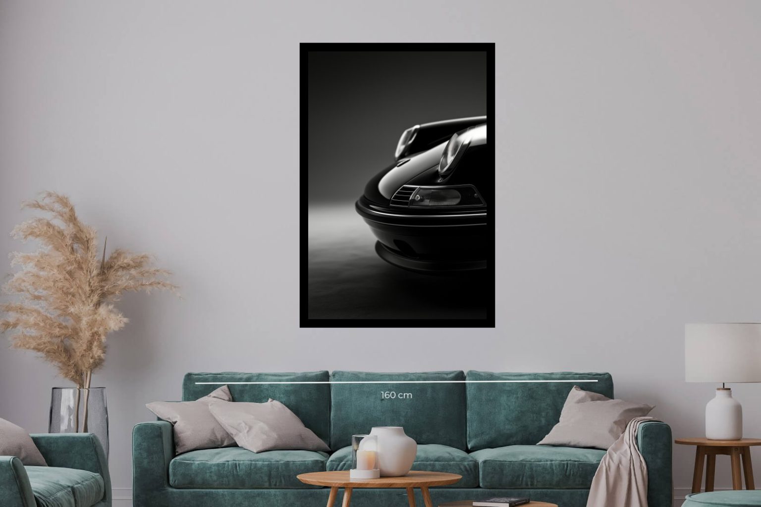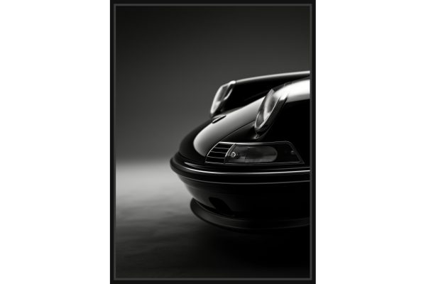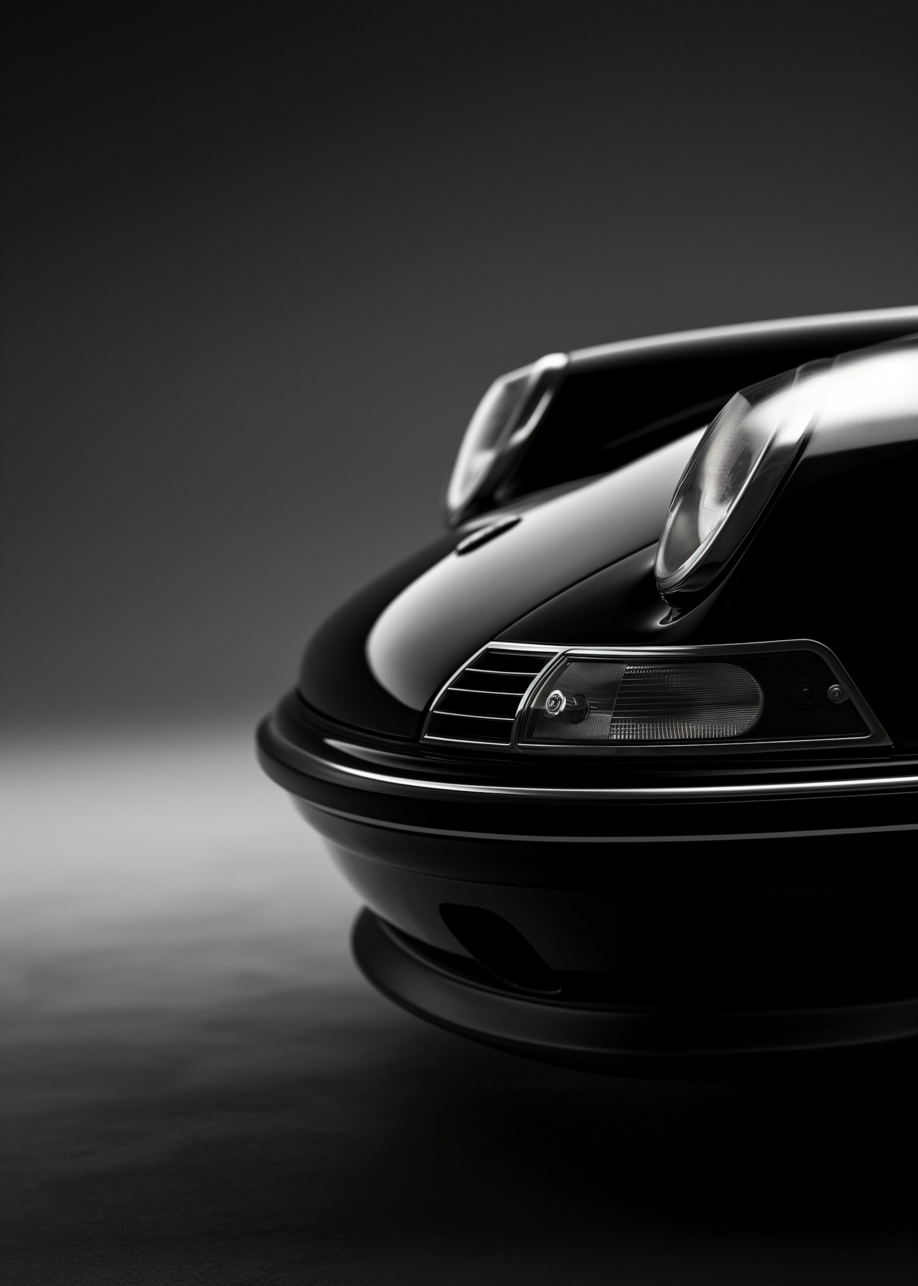 Впечатляваща фотография на черен класически автомобил, заснет в минималистична обстановка със студийна светлина. Хромираните детайли и гладките линии на каросерията подчертават ретро стила и вечната елегантност на дизайна. Този кадър внушава усещане за лукс, история и сила, като превръща автомобила в истинска икона на класиката.