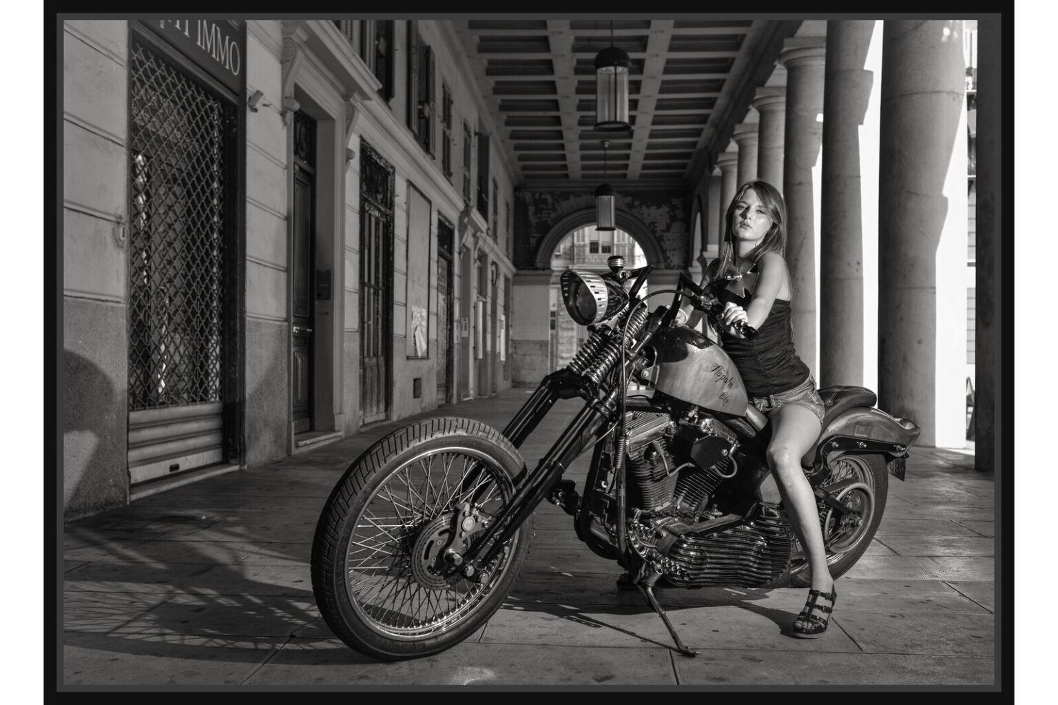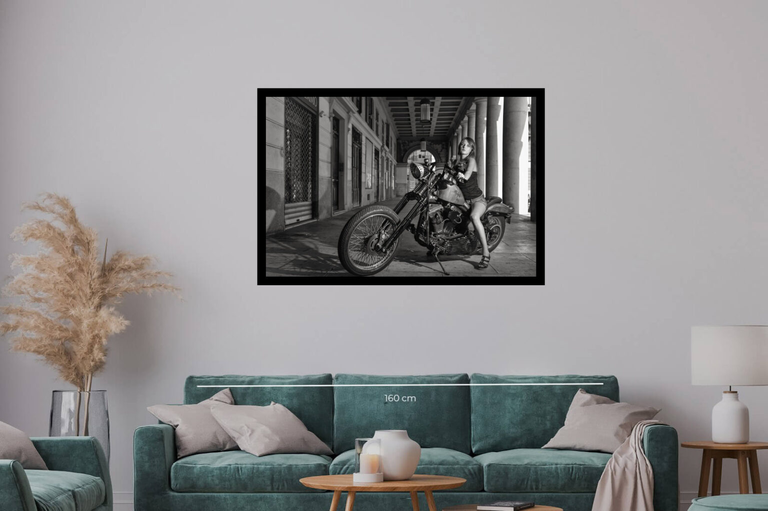 Художествен черно-бял кадър на мотор и модел, уловен в архитектурна среда с класически колони. Фотографията съчетава елегантност и бунтарски дух, подчертавайки естетиката на винтидж мотоциклет и свободата на движението. Идеален образ за интериор с характер и индивидуалност.