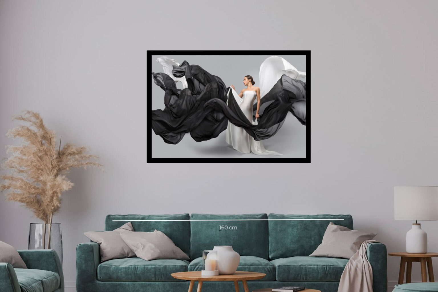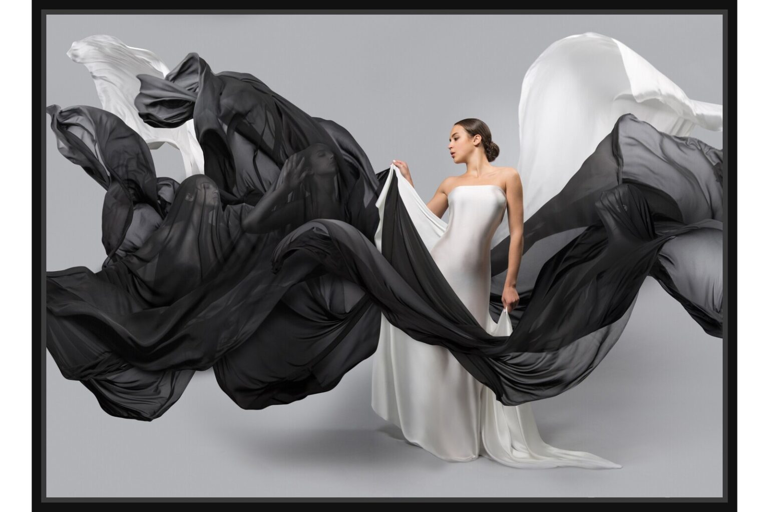 Фотография в черно-бяло, изобразяваща жена в бяла рокля, обгърната от контрастиращи черни воали. Динамична композиция, която съчетава енергия и нежност.
