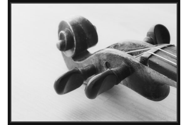 Черно-бяла фотография на цигулка в близък план, с акцент върху горната част на инструмента. Снимката носи усещане за минимализъм, елегантност и вечна класика.