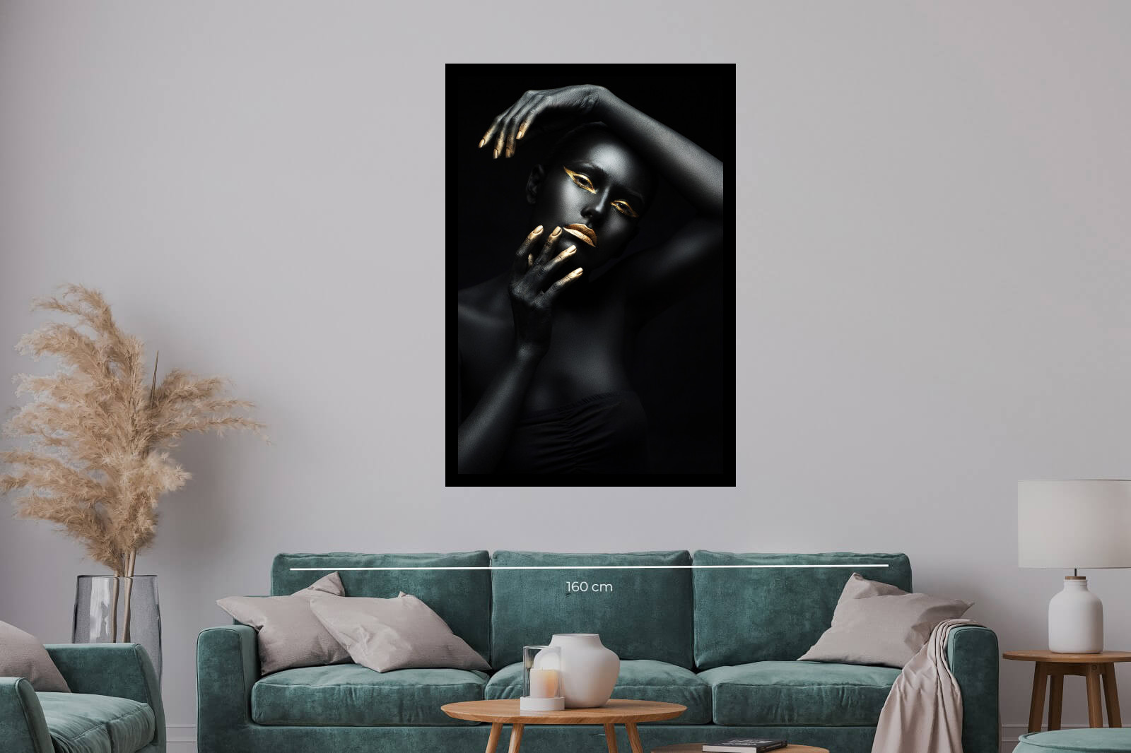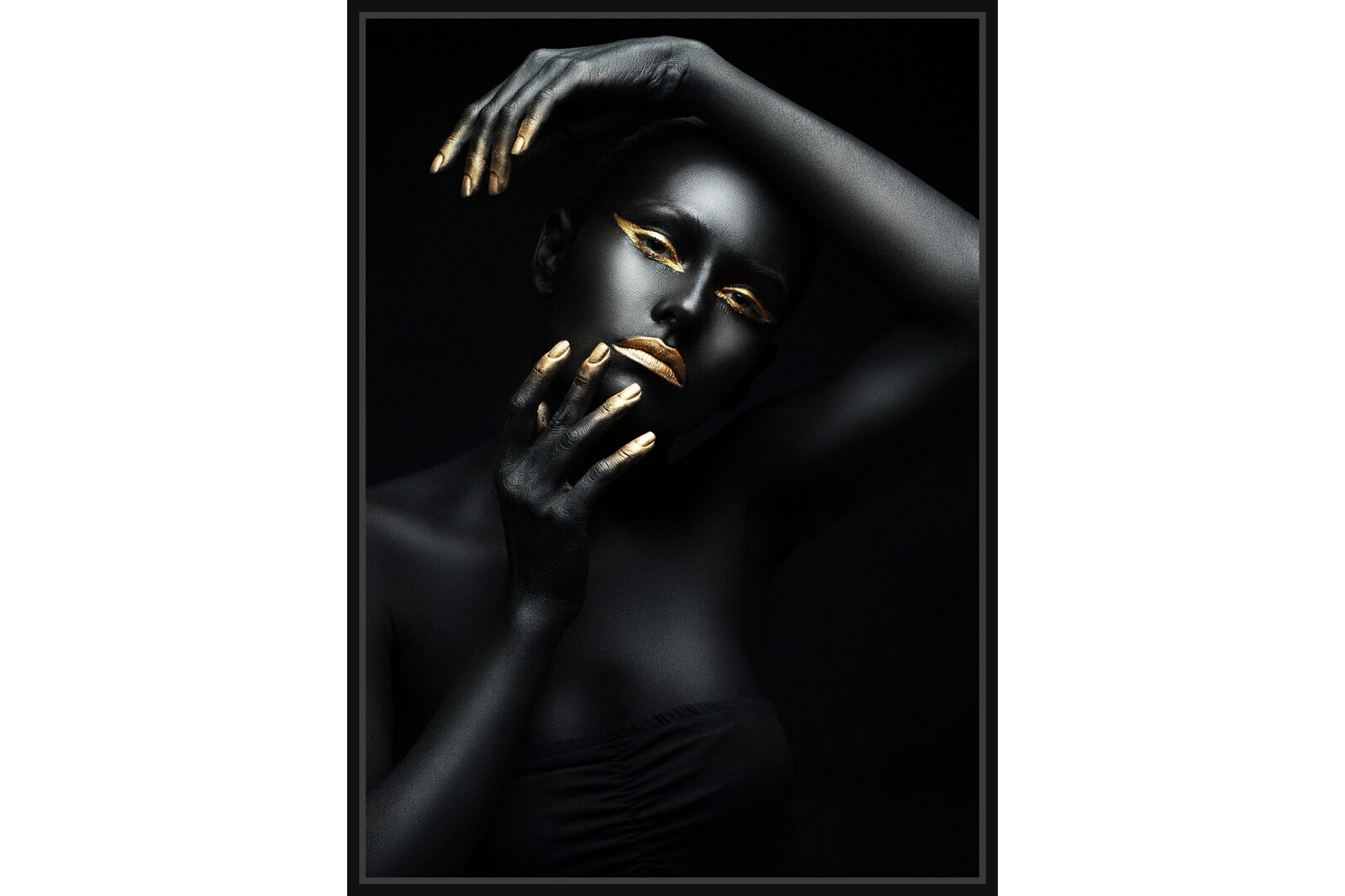 Елегантен художествен портрет на жена с черно тяло и златни акценти по устни, очи и нокти. Контрастът между матовата черна кожа и металическия златен блясък създава усещане за мистичност и лукс, подходящо за модерни интериори и арт колекции.
