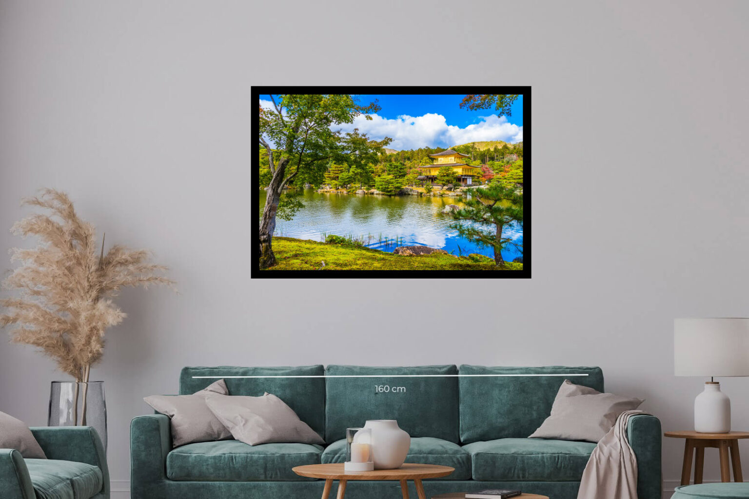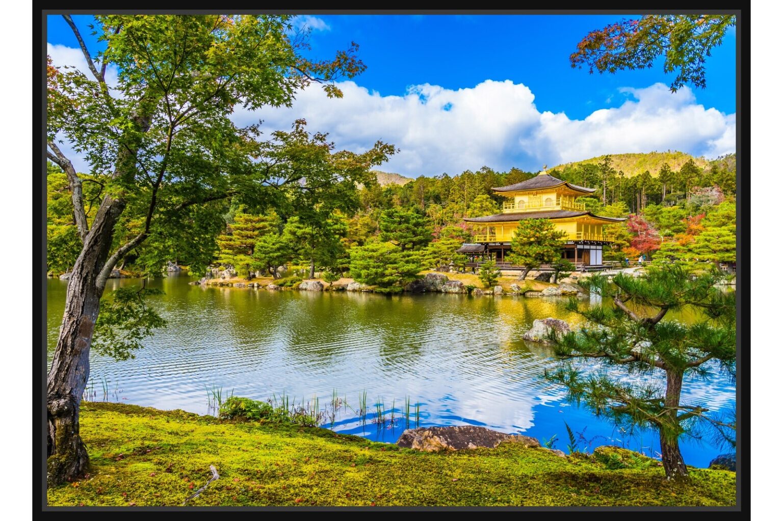 Фотография на японски храм Кинкаку-дзи, отразен в езеро, обградено от зеленина. Хармонията между архитектура и природа създава спокойна и вдъхновяваща атмосфера.