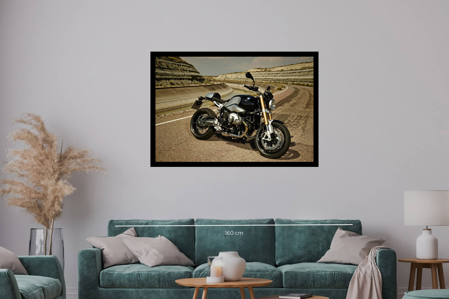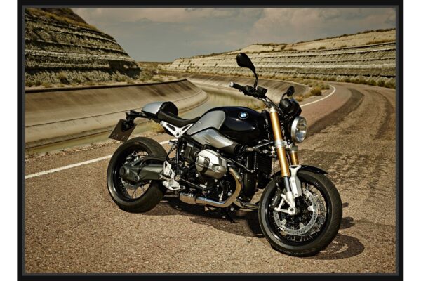 Мощен BMW мотор заснет на открит път сред скални формации. Снимката подчертава модерния дизайн, издръжливостта и свободата, които моторът символизира, съчетани с естествената красота на пейзажа.