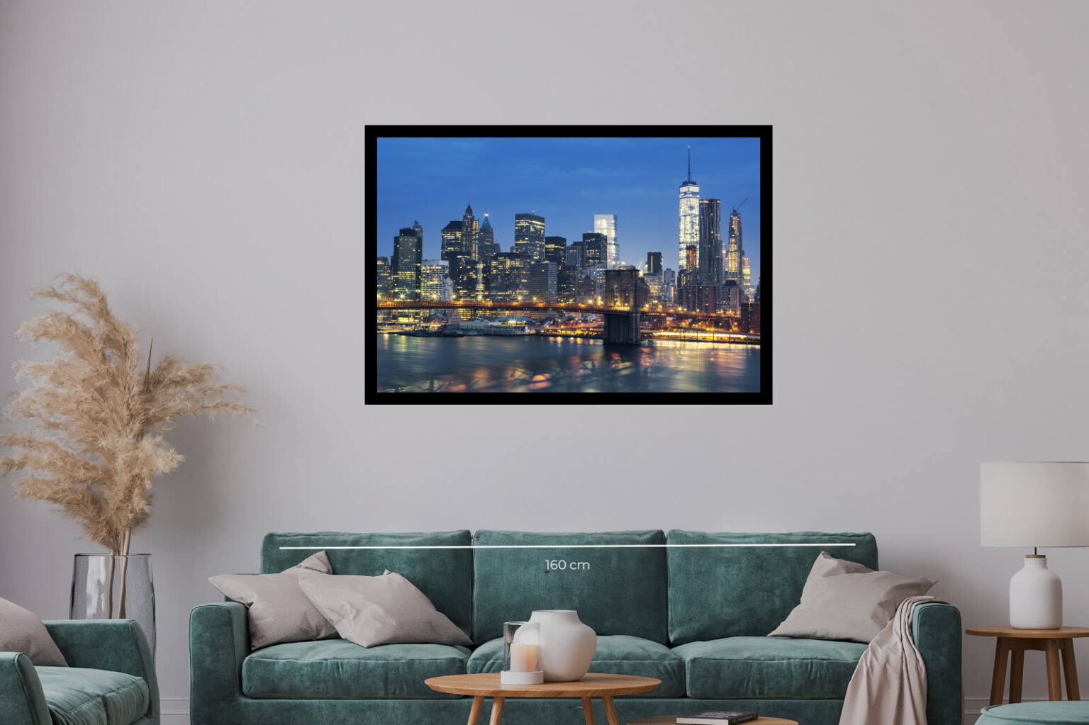 Фотография на Brooklyn Bridge и нощния силует на Ню Йорк. Осветените небостъргачи и мостът, огрян от светлини, създават енергична и иконична атмосфера, символ на мегаполиса, който никога не спи.