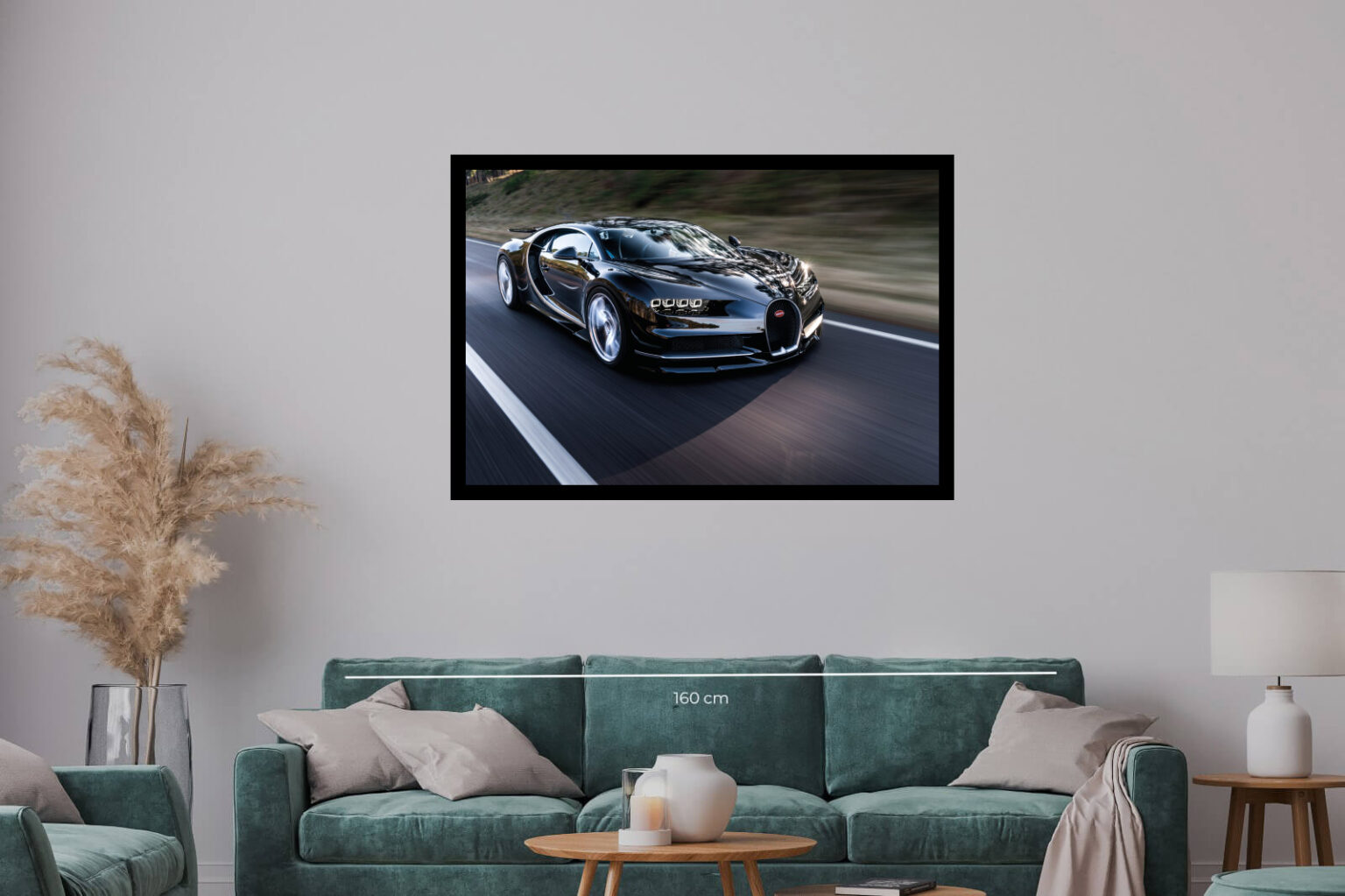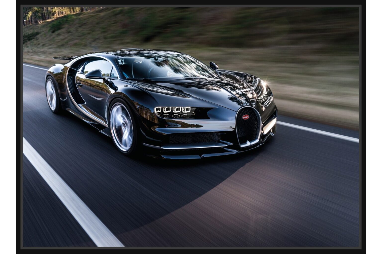 Емблематичният Bugatti Chiron в черен цвят заснет в движение. Снимката предава усещане за скорост, мощност и елегантност на пътя.