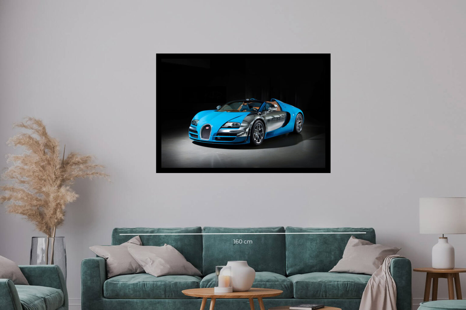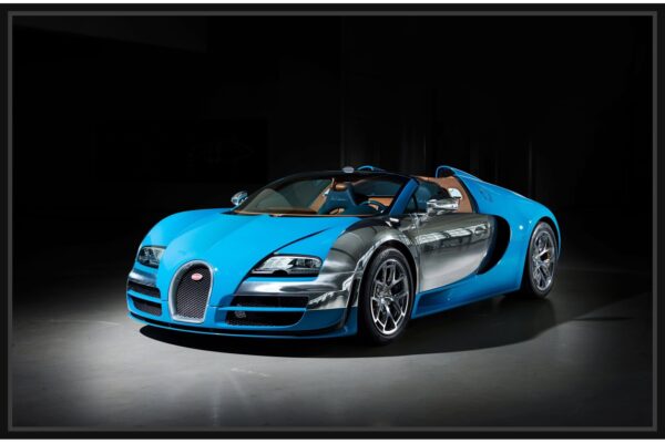 Bugatti Veyron в синьо и сребристо – елегантна комбинация от класически дизайн и мощен характер, заснета в студио.