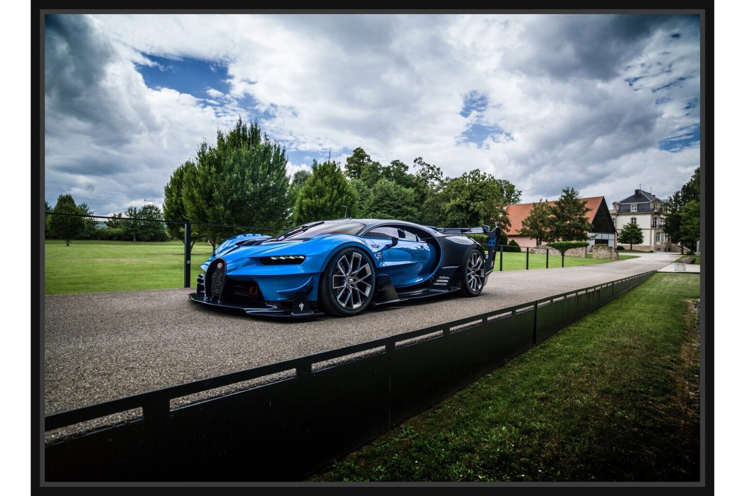 Синя Bugatti Vision Gran Turismo в елегантна среда.