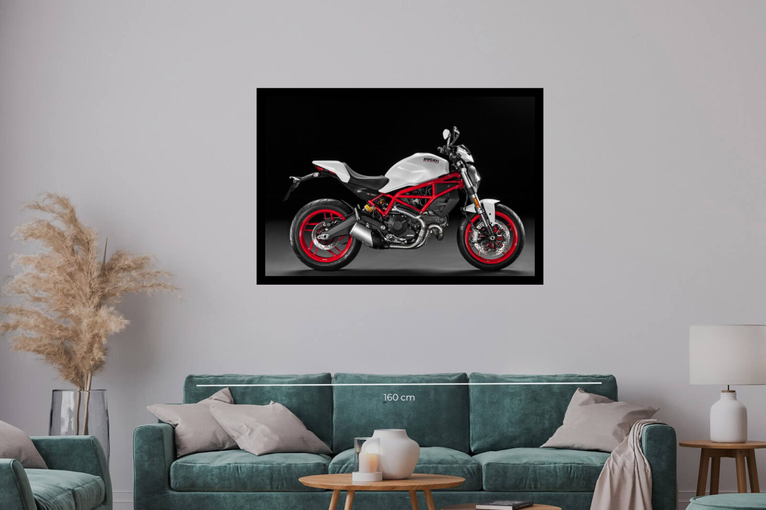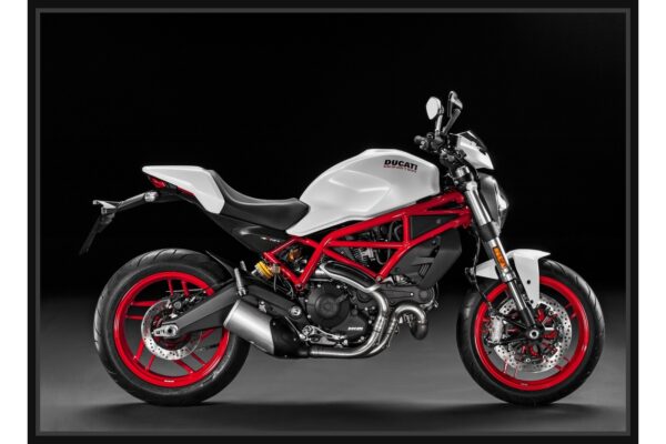 Фотография на бял Ducati Monster със спортна визия и червена рамка. Дизайнът е изчистен и минималистичен, като контрастът между бялото, червеното и черното придава модерен и мощен характер на мотора. Заснет на черен фон за максимално въздействие.