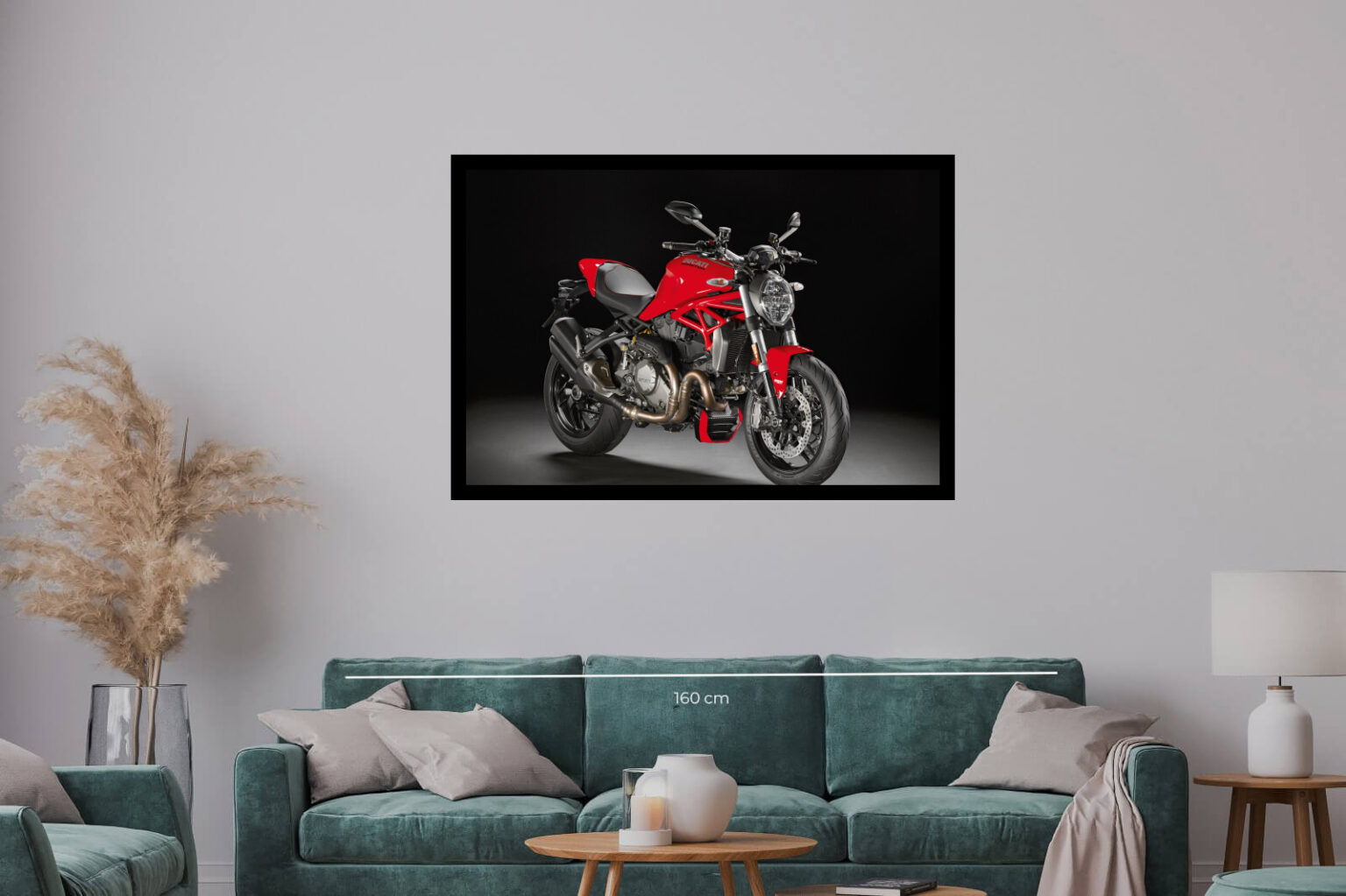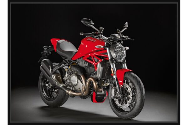 Професионална фотография на Ducati Monster в ярко червено. Изображението подчертава динамичния дизайн, мощния двигател и елегантните детайли на мотора. Заснет на тъмен фон, който контрастира с червената цветова гама и акцентира върху спортния характер на машината.