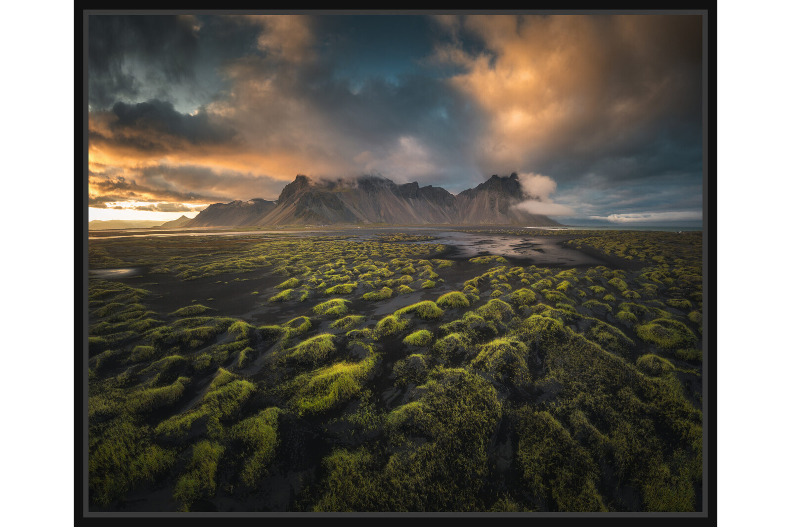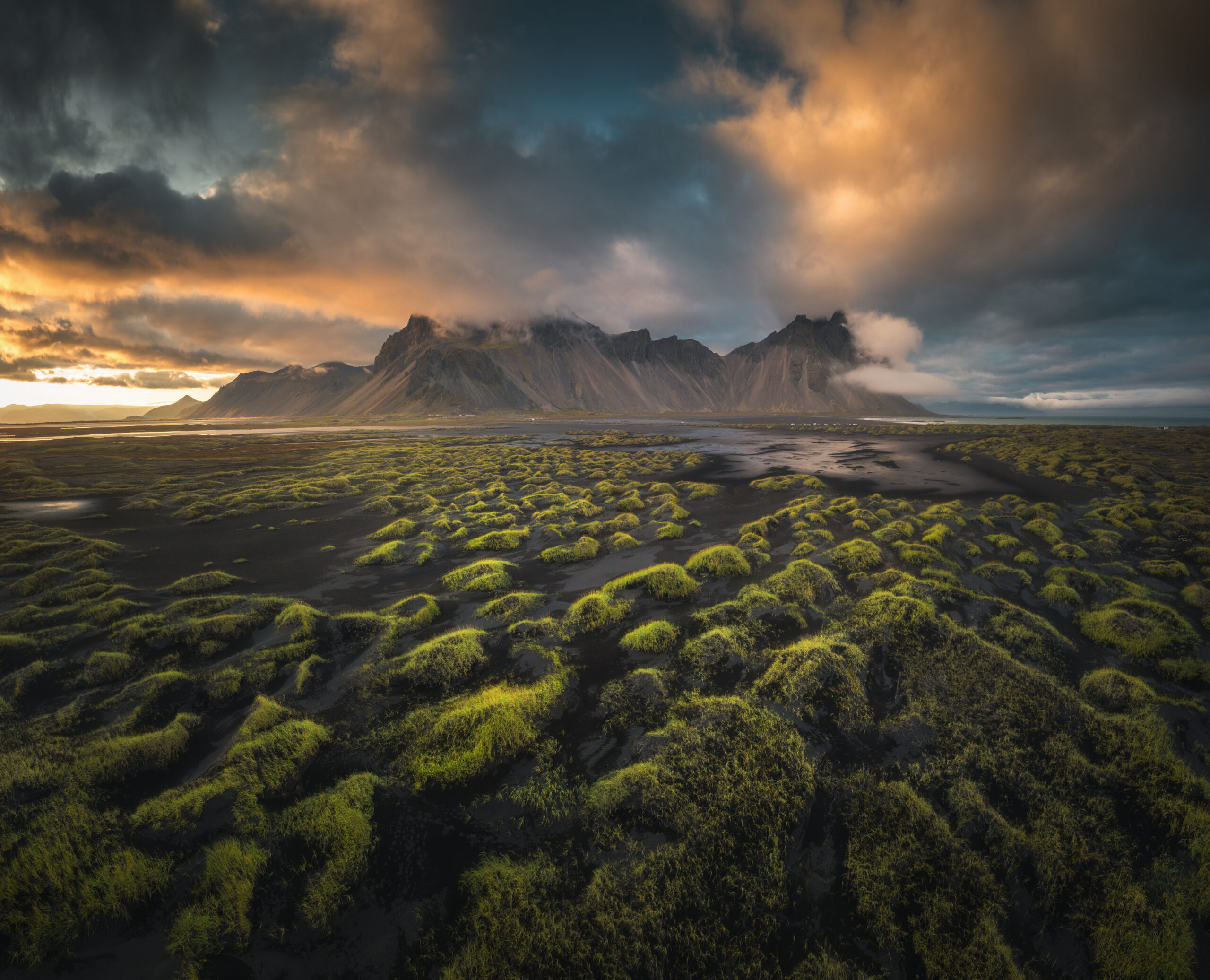 Плажът Stokksnes в Исландия разкрива магията на черния пясък и причудливите дюни, оформени от вятъра. В далечината величествено се извисява планината Vestrahorn, чиито стръмни склонове се отразяват в спокойните води. Контрастът между черния пясък, златистите дюни и суровата планинска красота създава пейзаж, който сякаш е от друг свят.