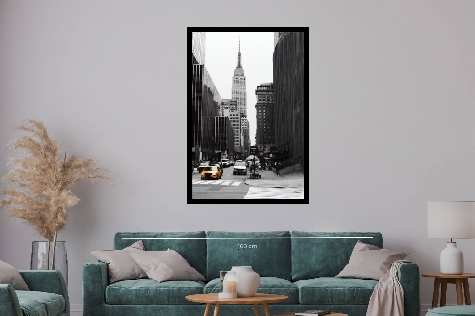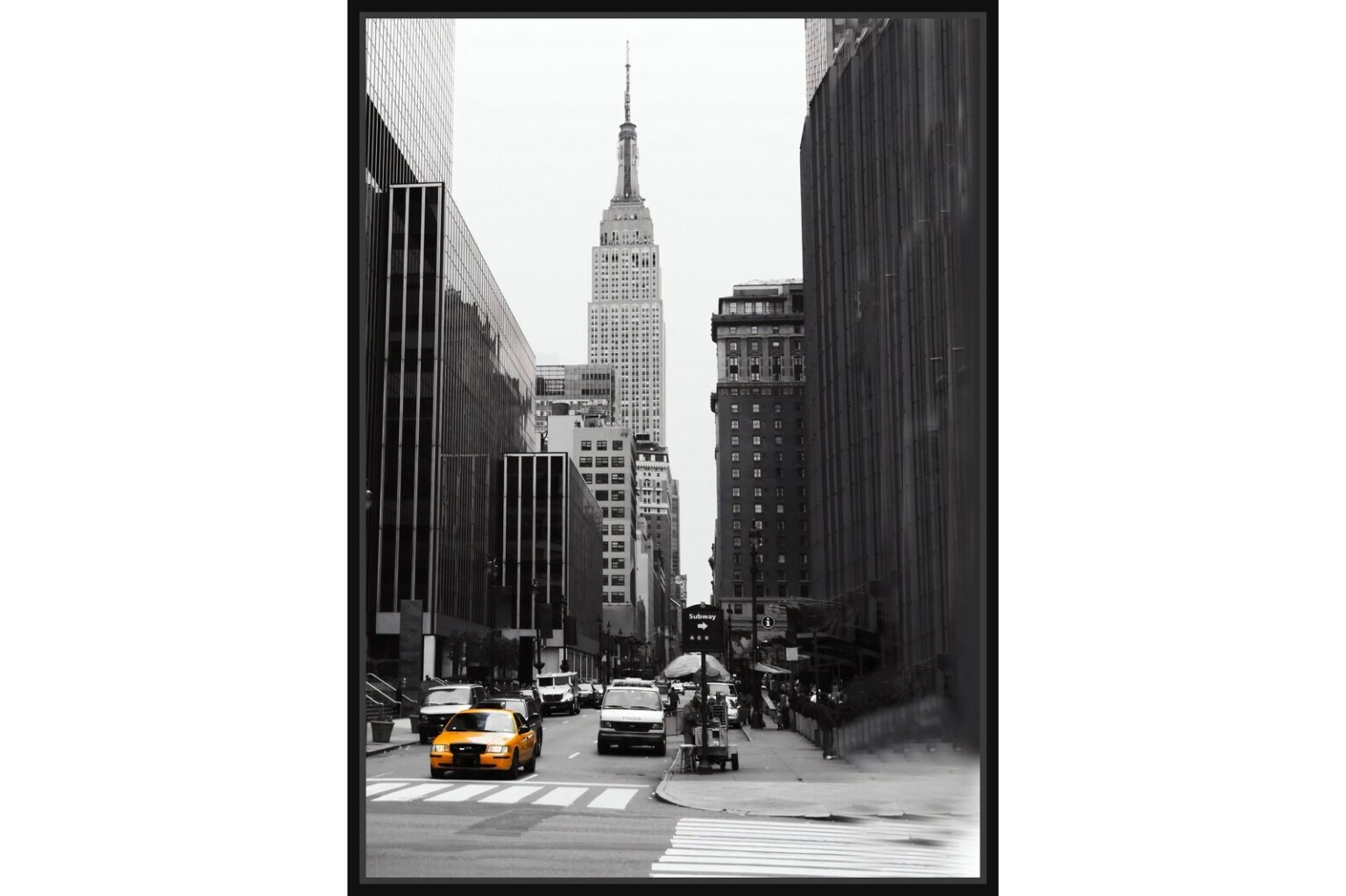 Черно-бяла фотография на улица в Ню Йорк с емблематичния силует на Empire State Building и акцент върху жълтото такси. Кадърът съчетава класическия дух на Манхатън с артистичен контраст между черно-бялото и яркия цвят.