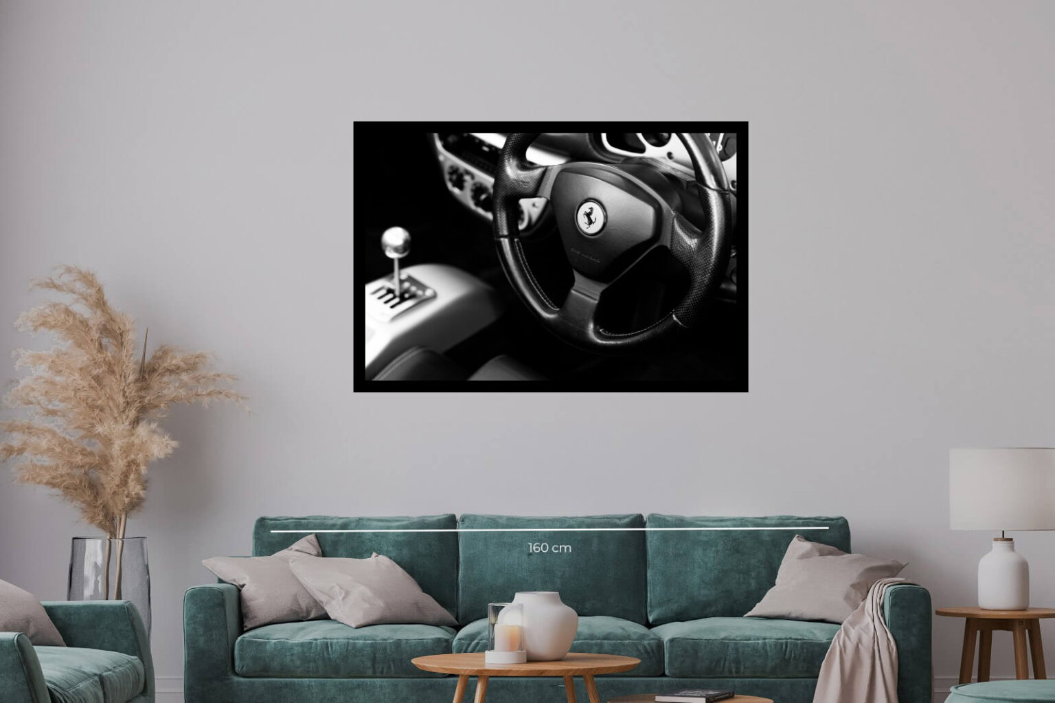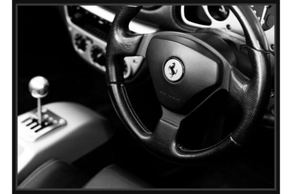 Черно-бяла фотография на интериора на Ferrari, с фокус върху волана и скоростния лост. Детайл, който подчертава елегантността и спортния дух на автомобила.
