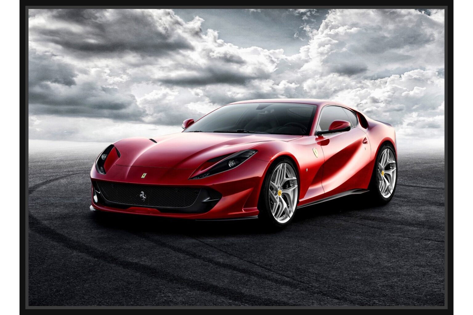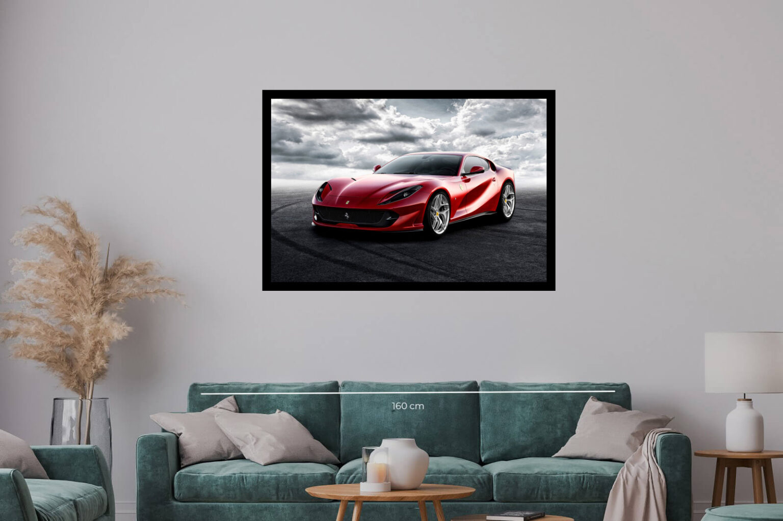 Фотография на червен спортен автомобил Ferrari, заснет на асфалтов път с драматично облачно небе. Символ на мощ, стил и италиански дизайн.