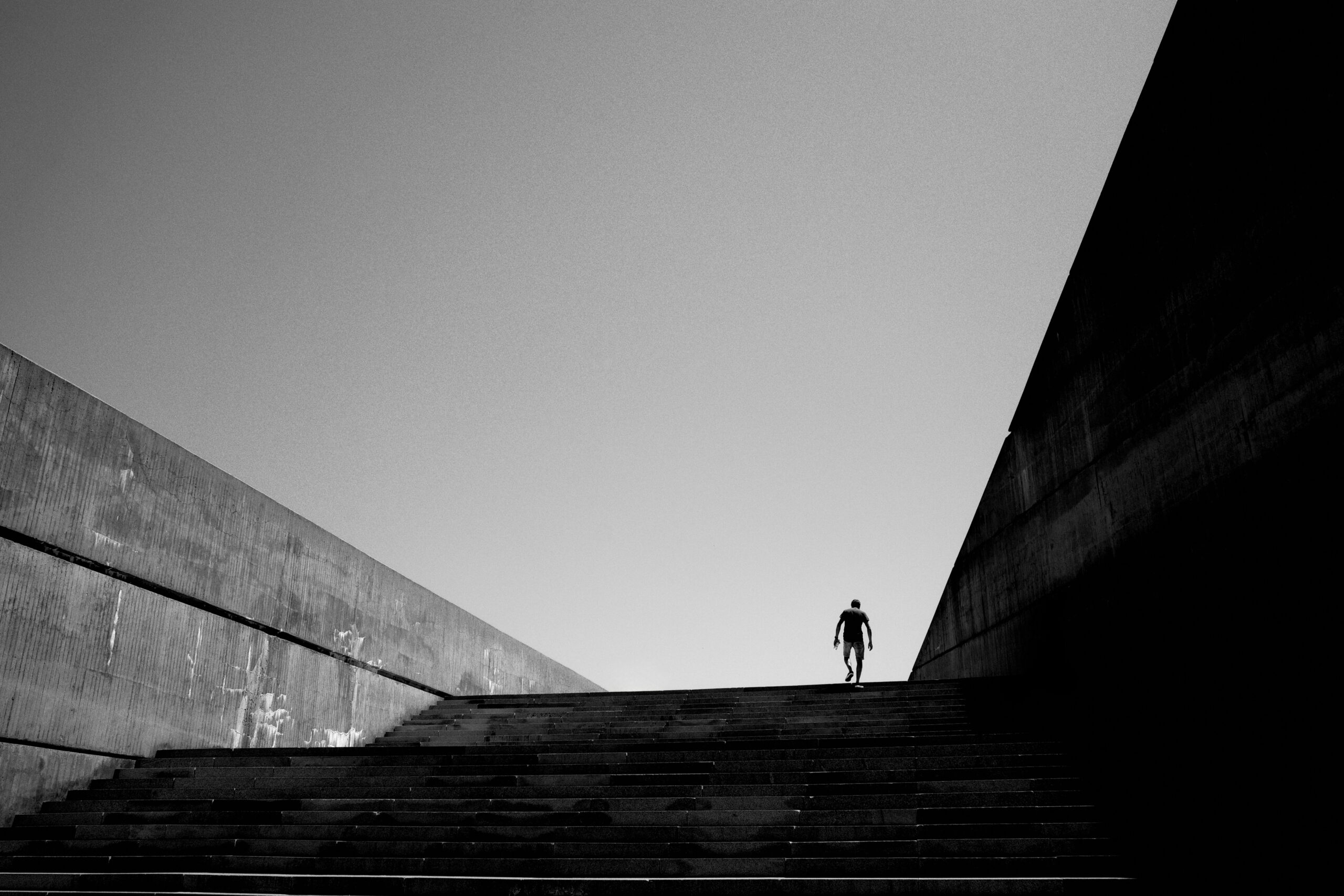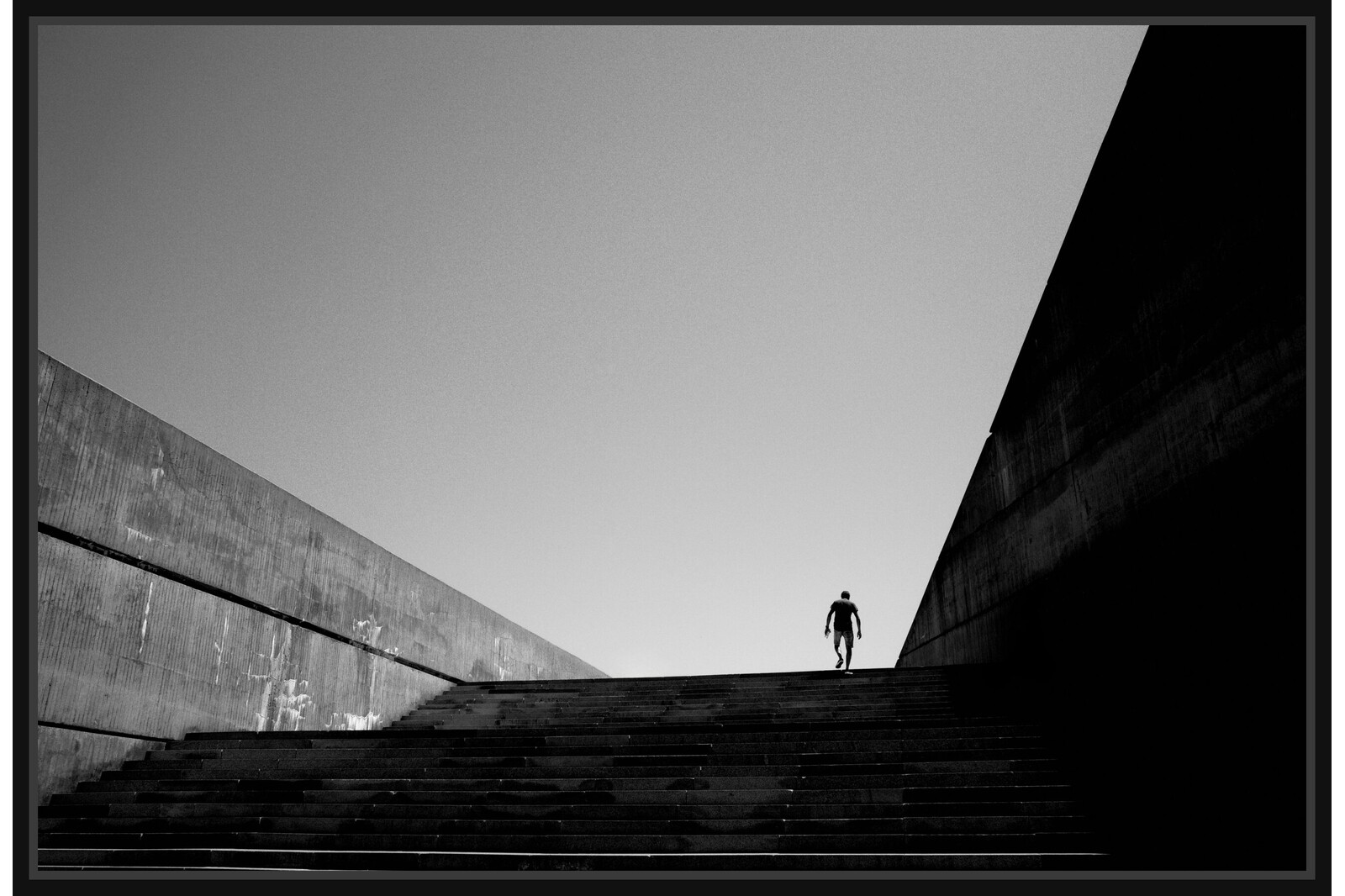Графична творба, която улавя момента на амбиция и изкачване. Силуетът на човешка фигура, вървяща нагоре, е поставен в центъра, символизирайки усилието, решимостта и пътя към успеха или неизвестността. Силният контраст и ниският ъгъл придават на сцената епично, почти героично усещане. Това е метафора за борбата и шанса, които съпътстват всяко голямо начинание. Идеална за колекционери, които ценят драматичната, мотивираща фотография с архитектурен елемент.