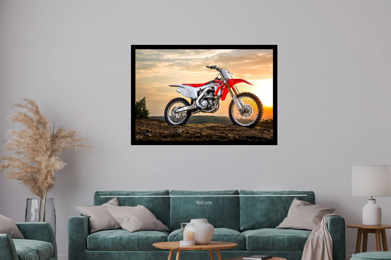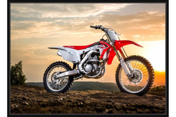 Фотография на Honda крос мотор, заснет на фона на залязващото слънце. Изображението носи динамика и енергия, подчертавайки приключенския дух и свободата на движение по пресечен терен.