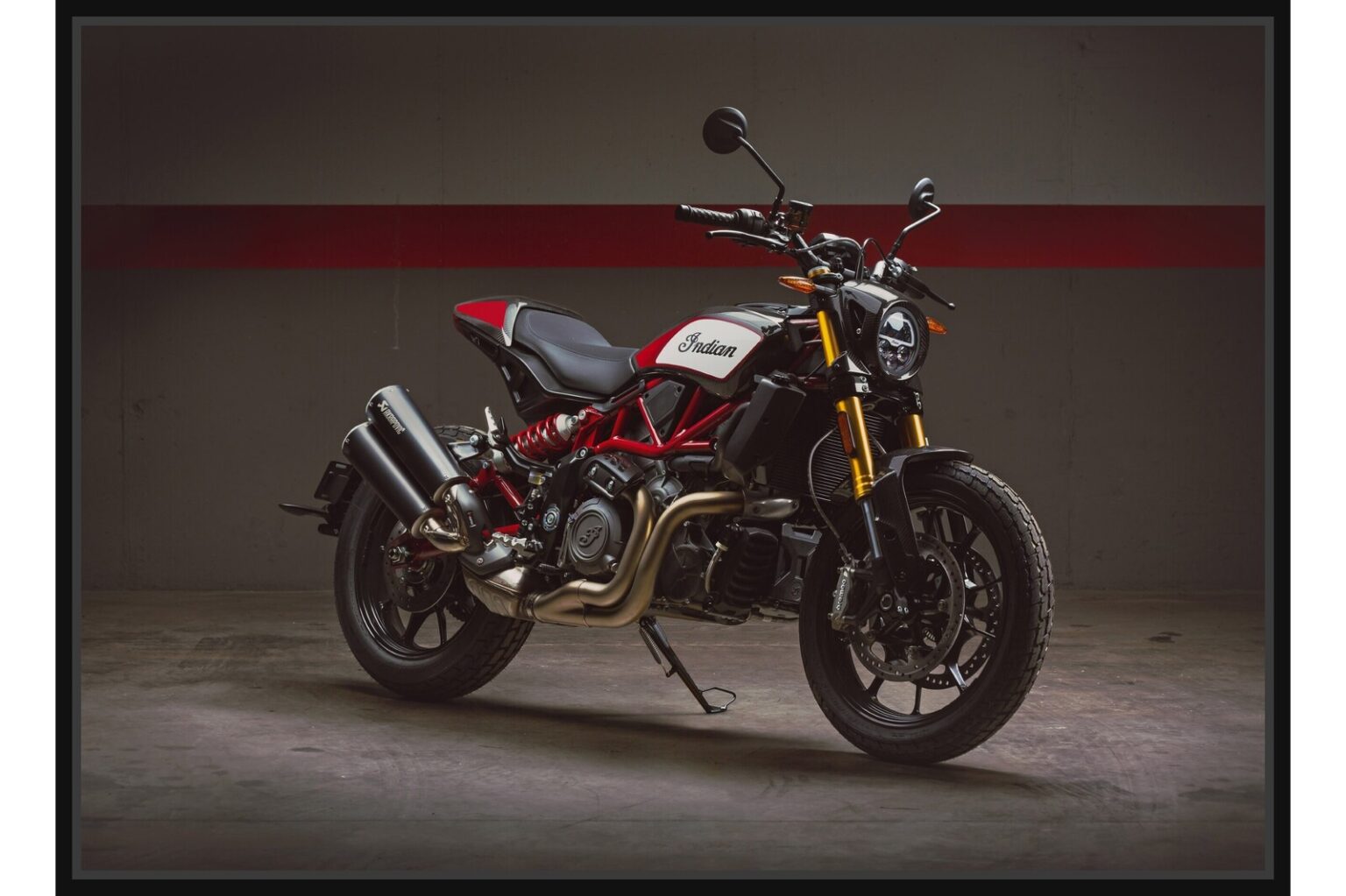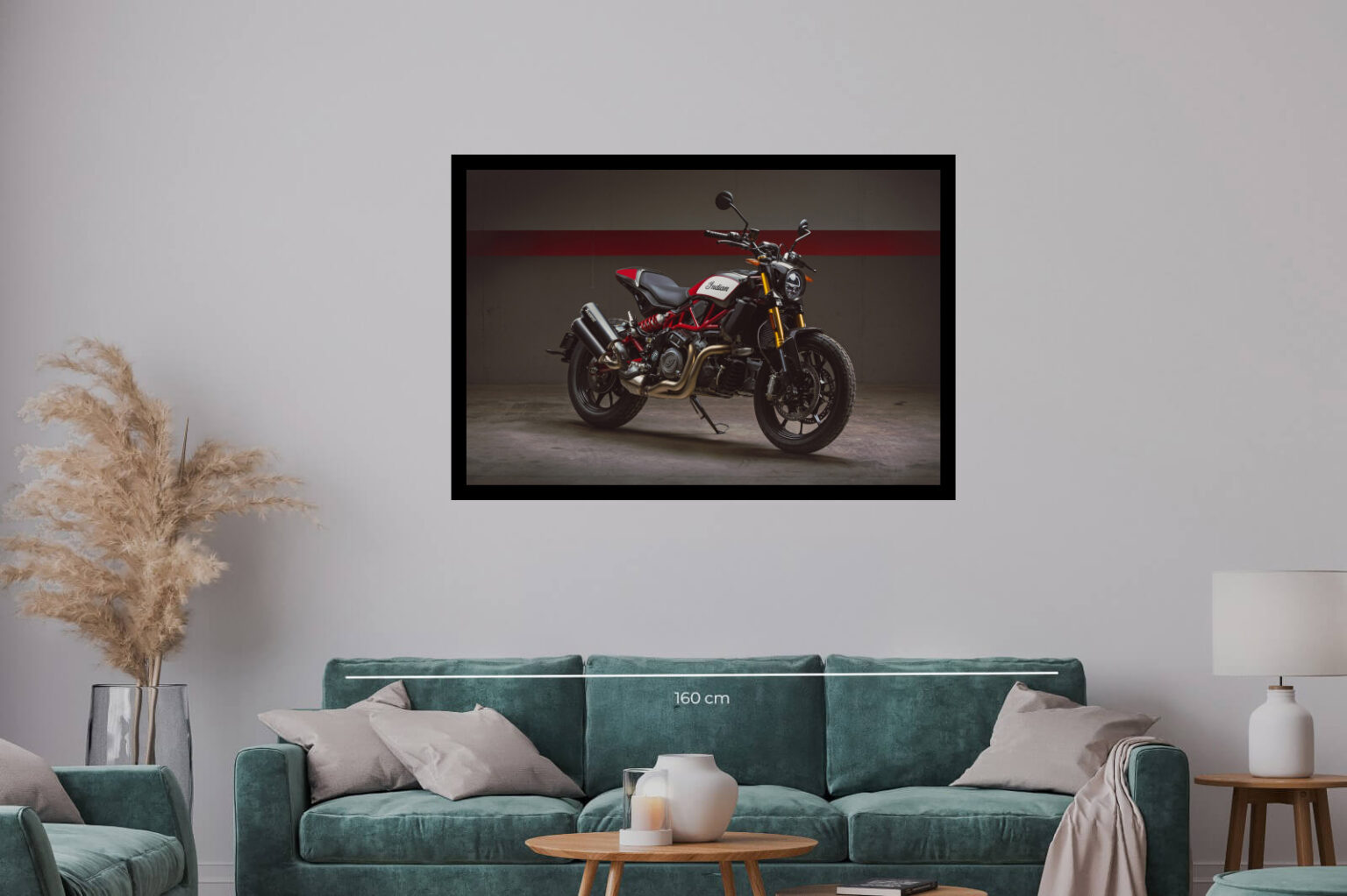Снимка на Indian мотоциклет, заснет в индустриална обстановка с драматично осветление. Класическият червен цвят и ретро детайли създават контраст с модерния бетонен фон.