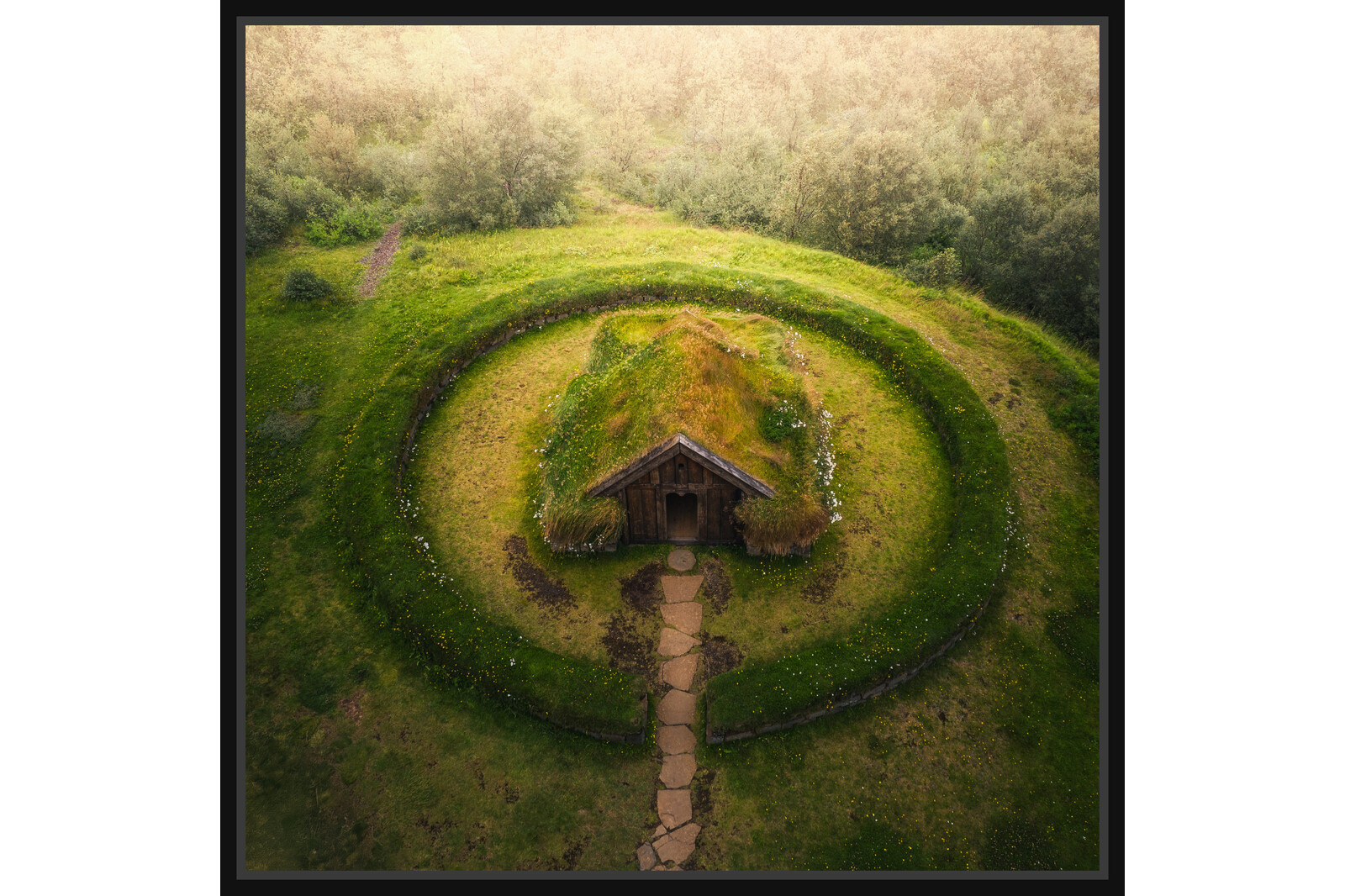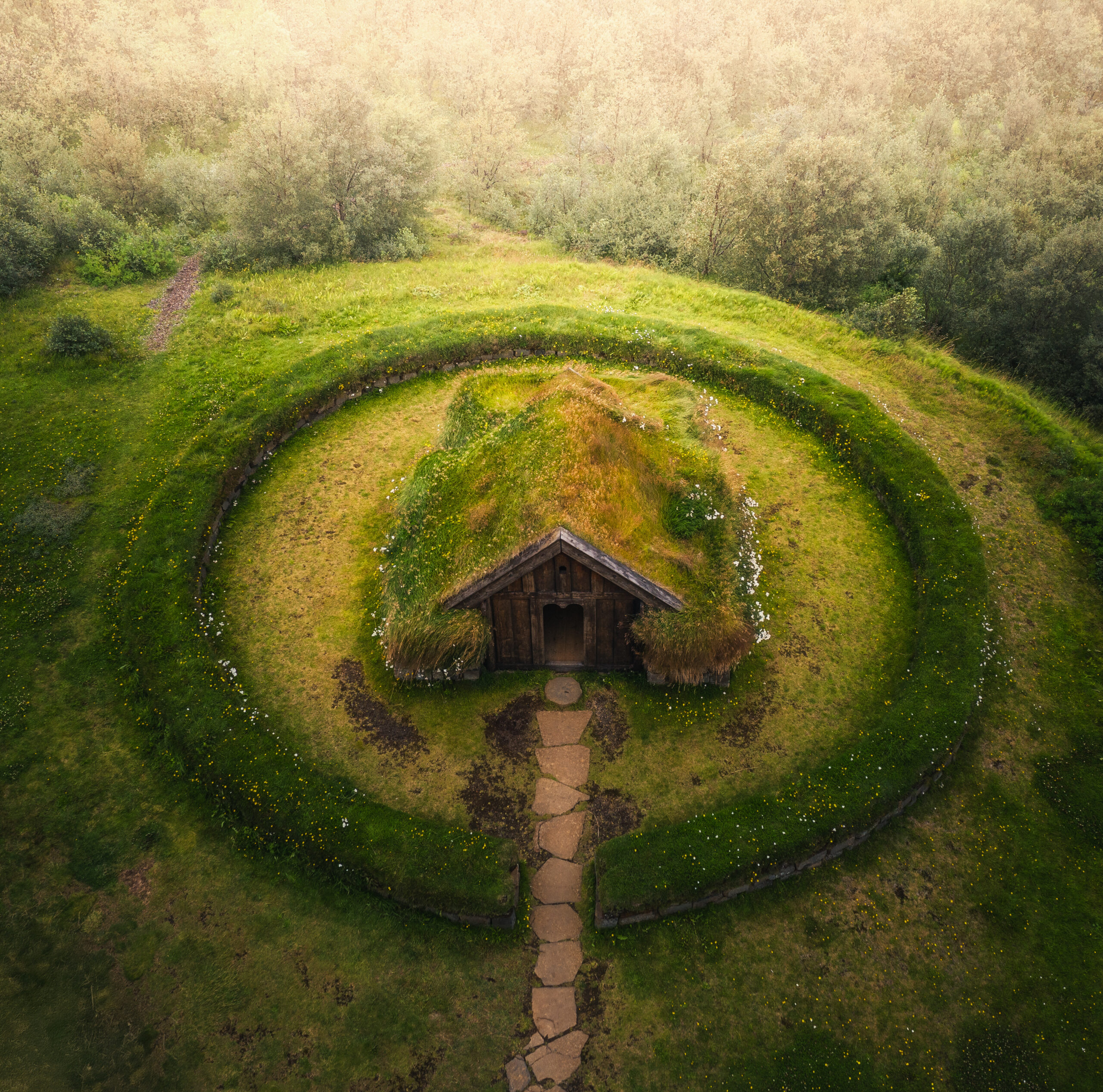 В исландската дива природа се крие тази приказна торфена къщичка с тревен покрив, заобиколена от мистериозен зелен кръг. На пръв поглед изглежда като дом на тролове от легендите, но всъщност е традиционна исландска архитектура – създадена да пази топлина и да се слива с пейзажа.