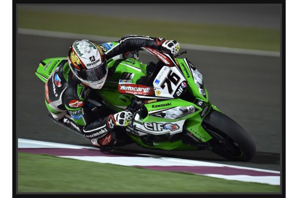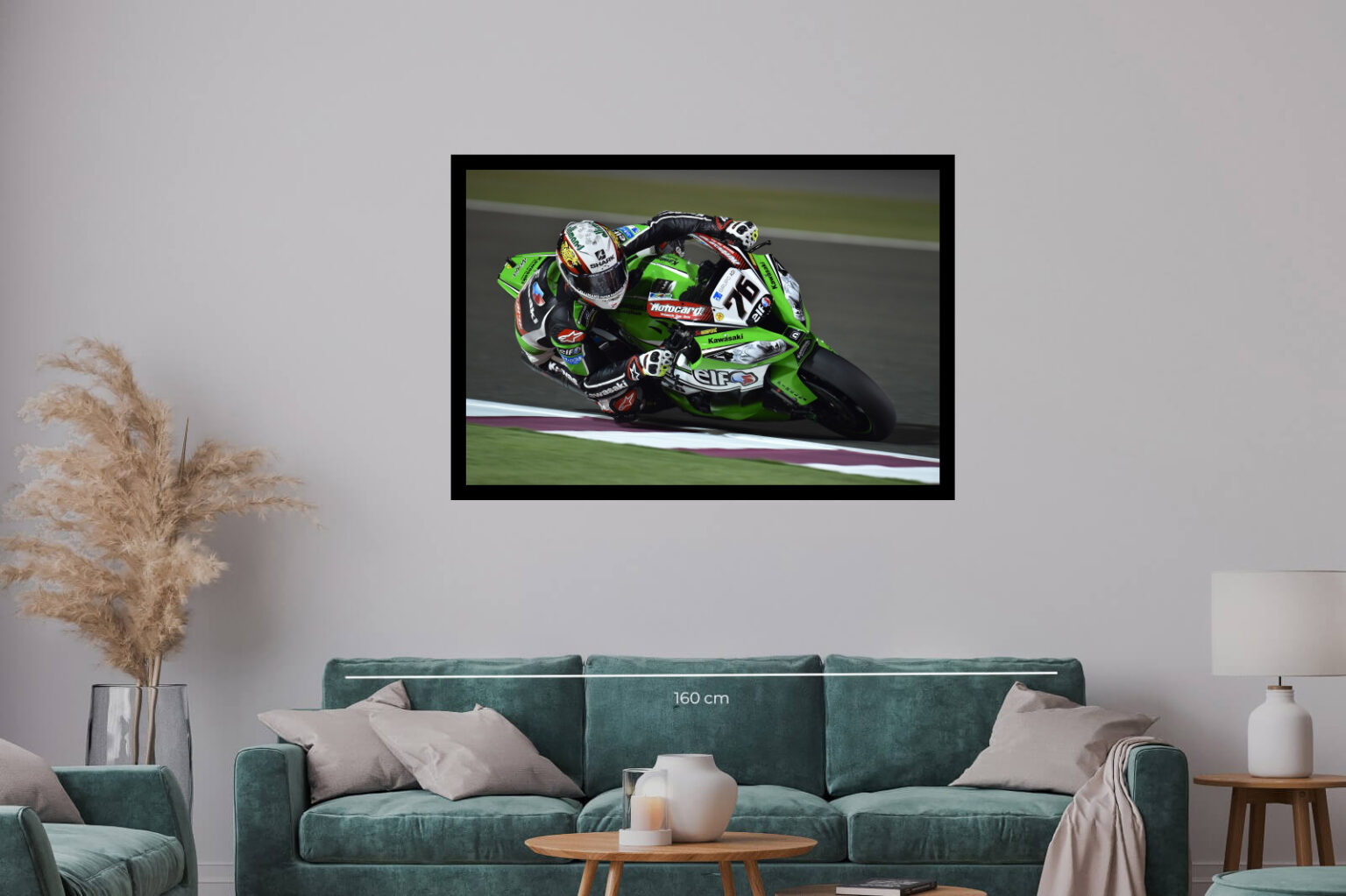 Състезателен мотор Kawasaki Ninja в зелено, уловен в динамичен кадър на пистата. Снимката пресъздава скорост, контрол и професионализъм в моторните спортове.