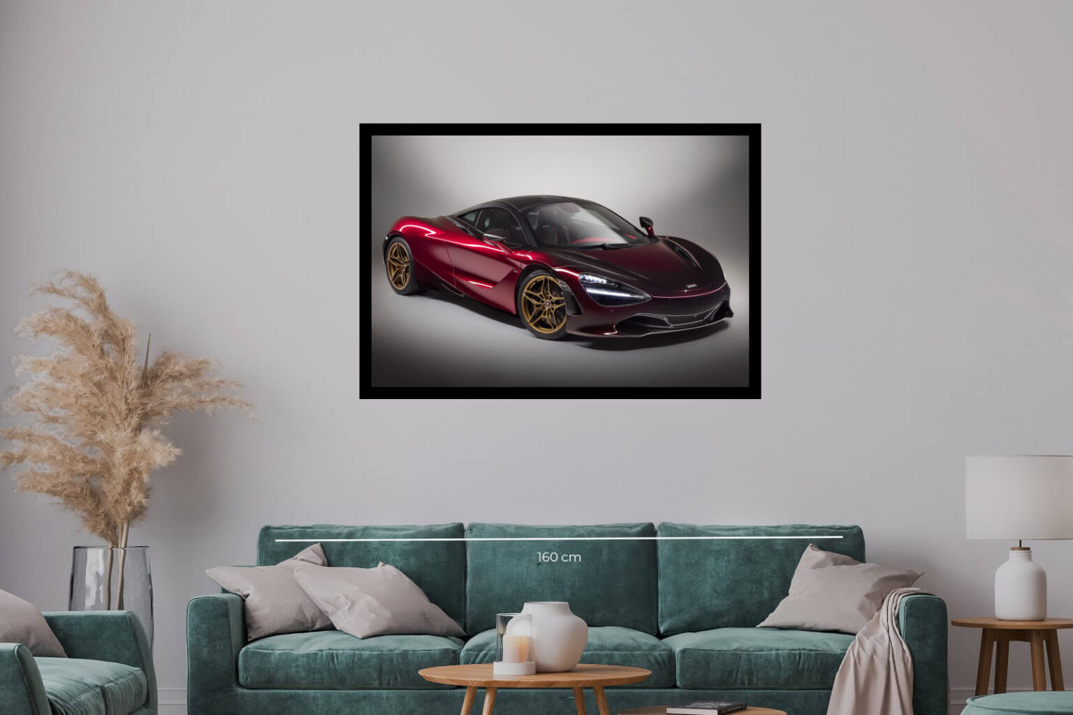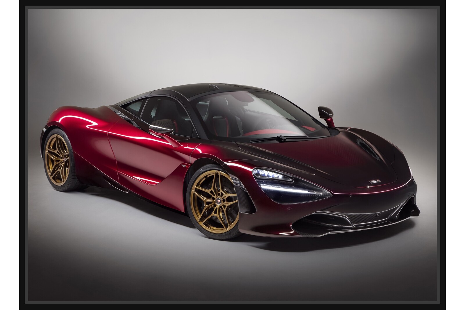 Елегантен McLaren 720S в бордо с контрастни златисти джанти, заснет в студийна обстановка. Лукс и спортен дух, съчетани в един автомобил.