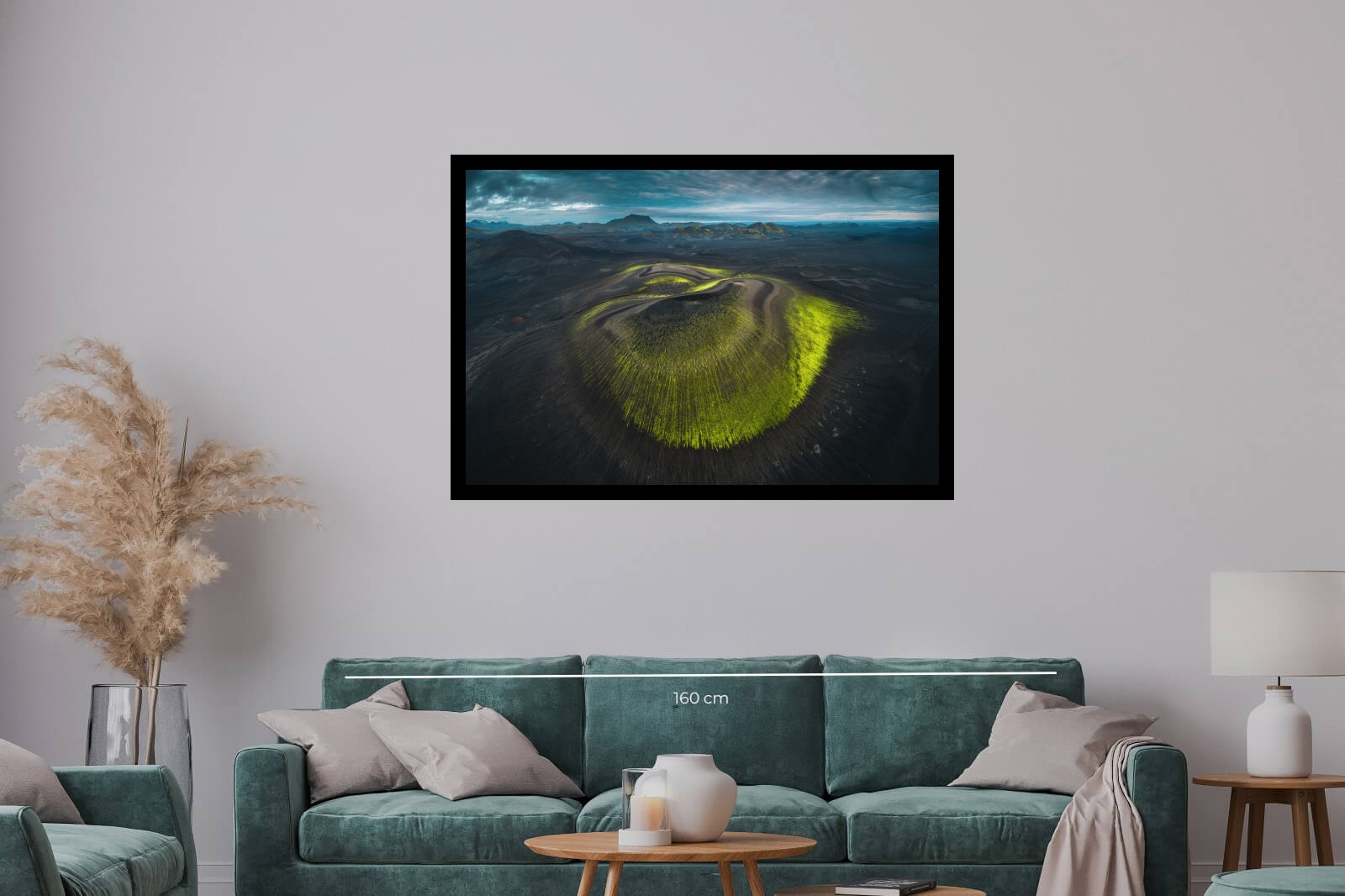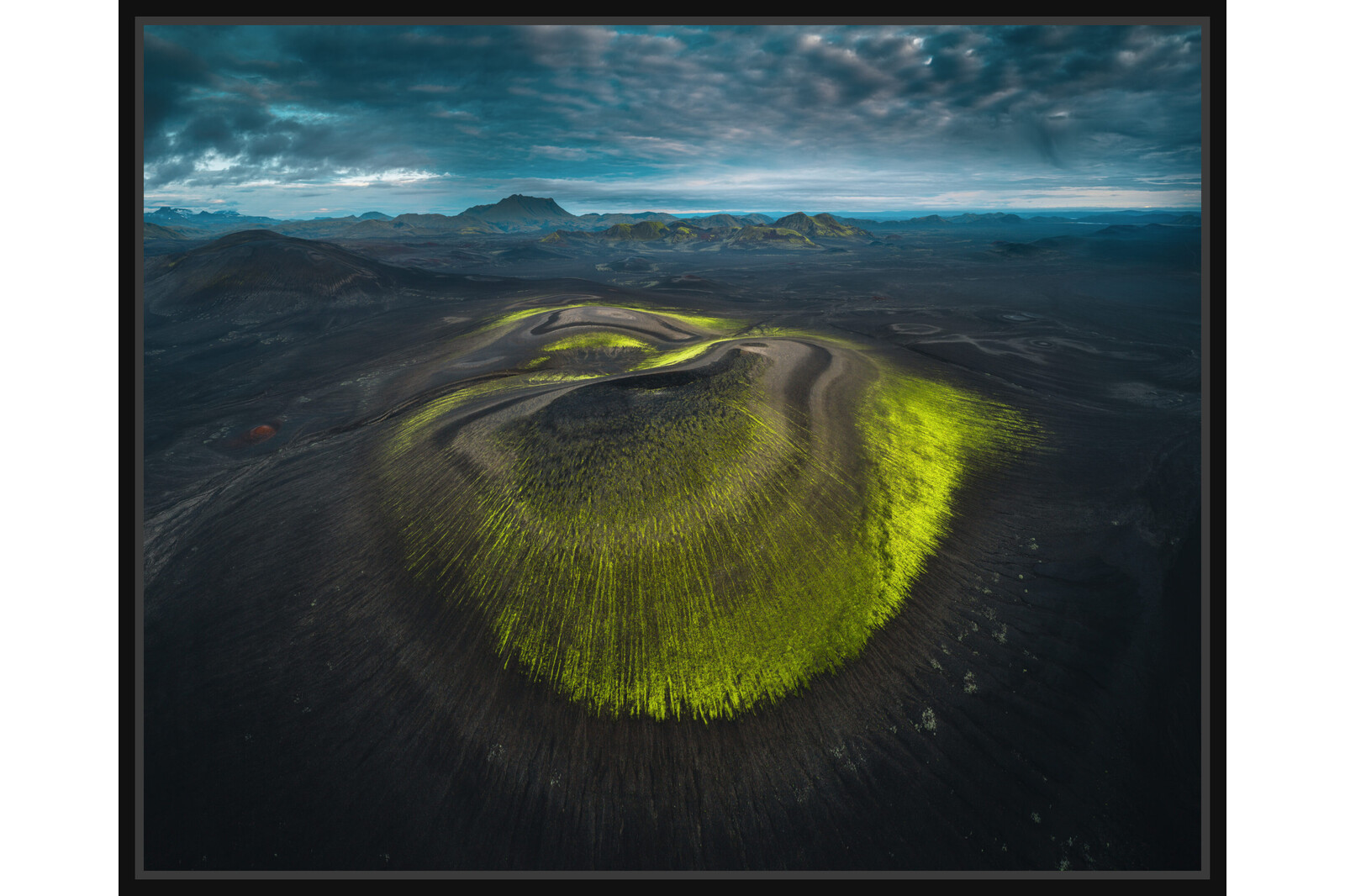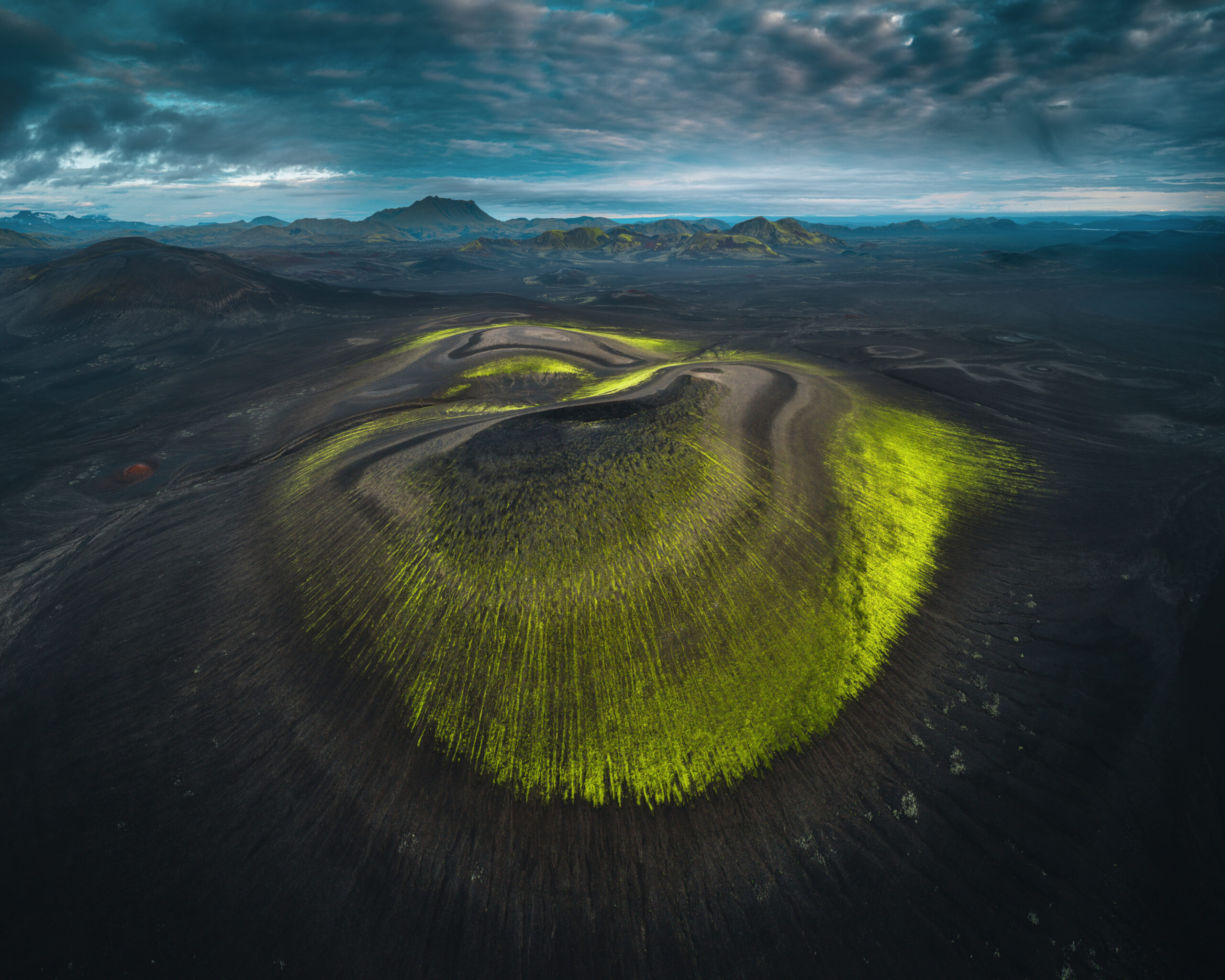 Този хълм се издига сред тъмните вулканични полета на Исландия. Зелените ивици мъх обгръщат склоновете като естествени контурни линии – оформени от дъждовете, вятъра и вулканичните пластове под тях. Там, където влагата се задържа, мъхът оживява и рисува върху суровия терен картина, която изглежда почти извънземна.