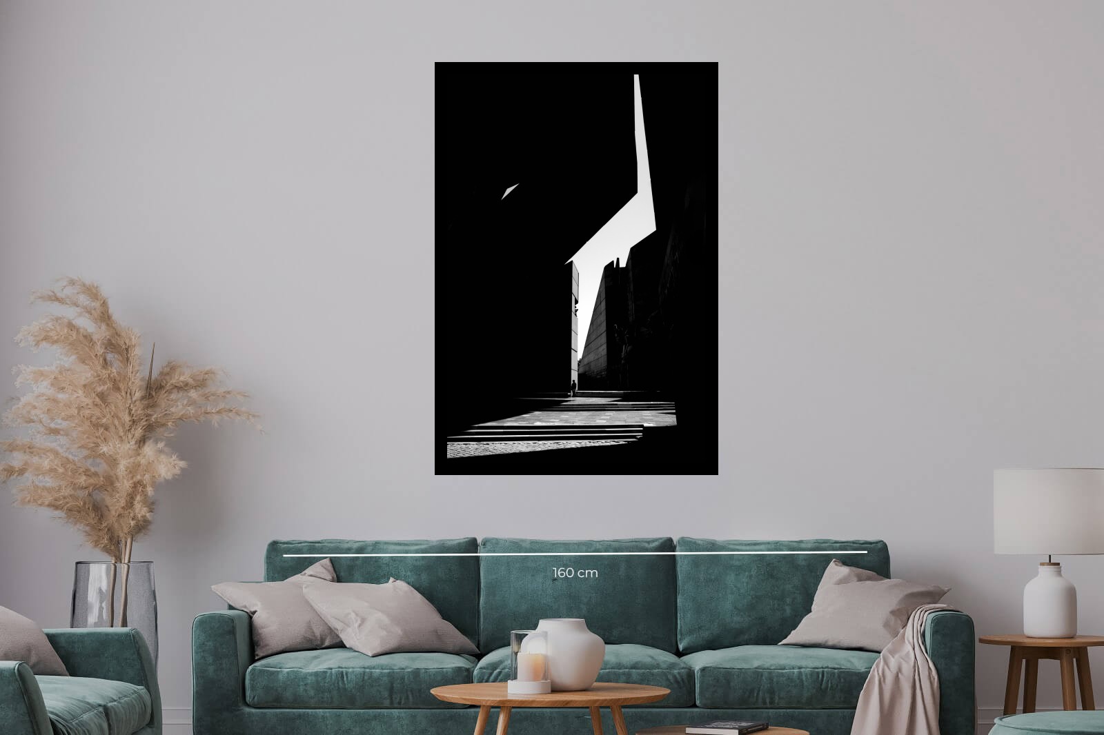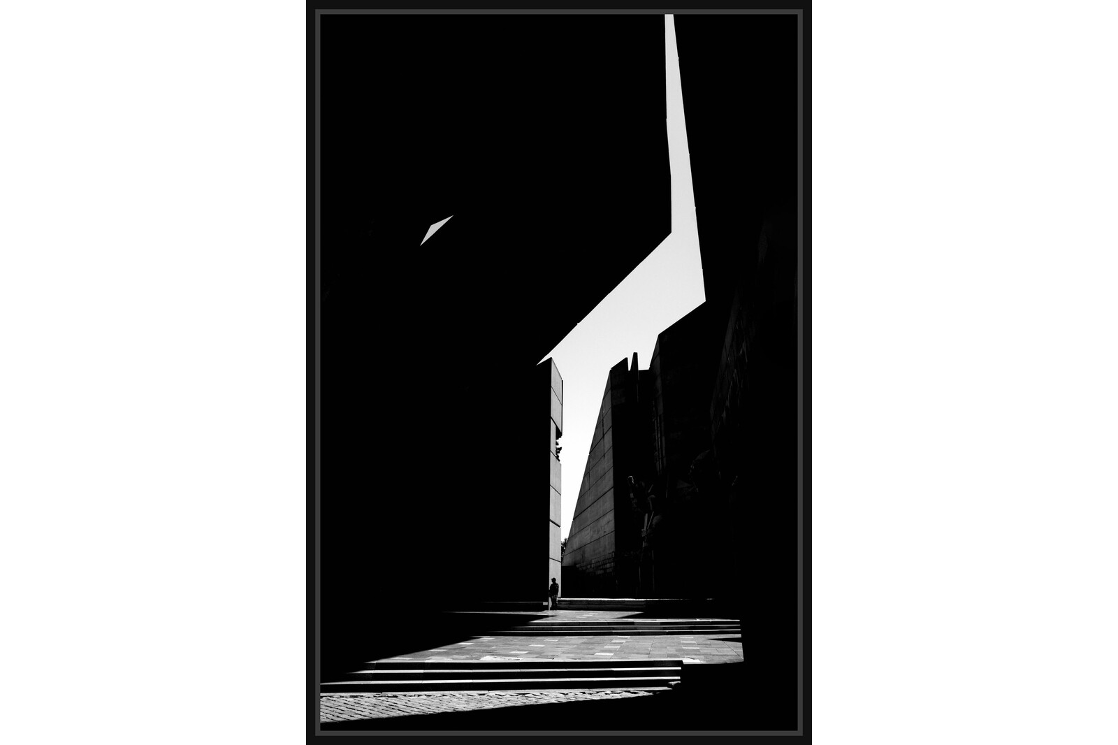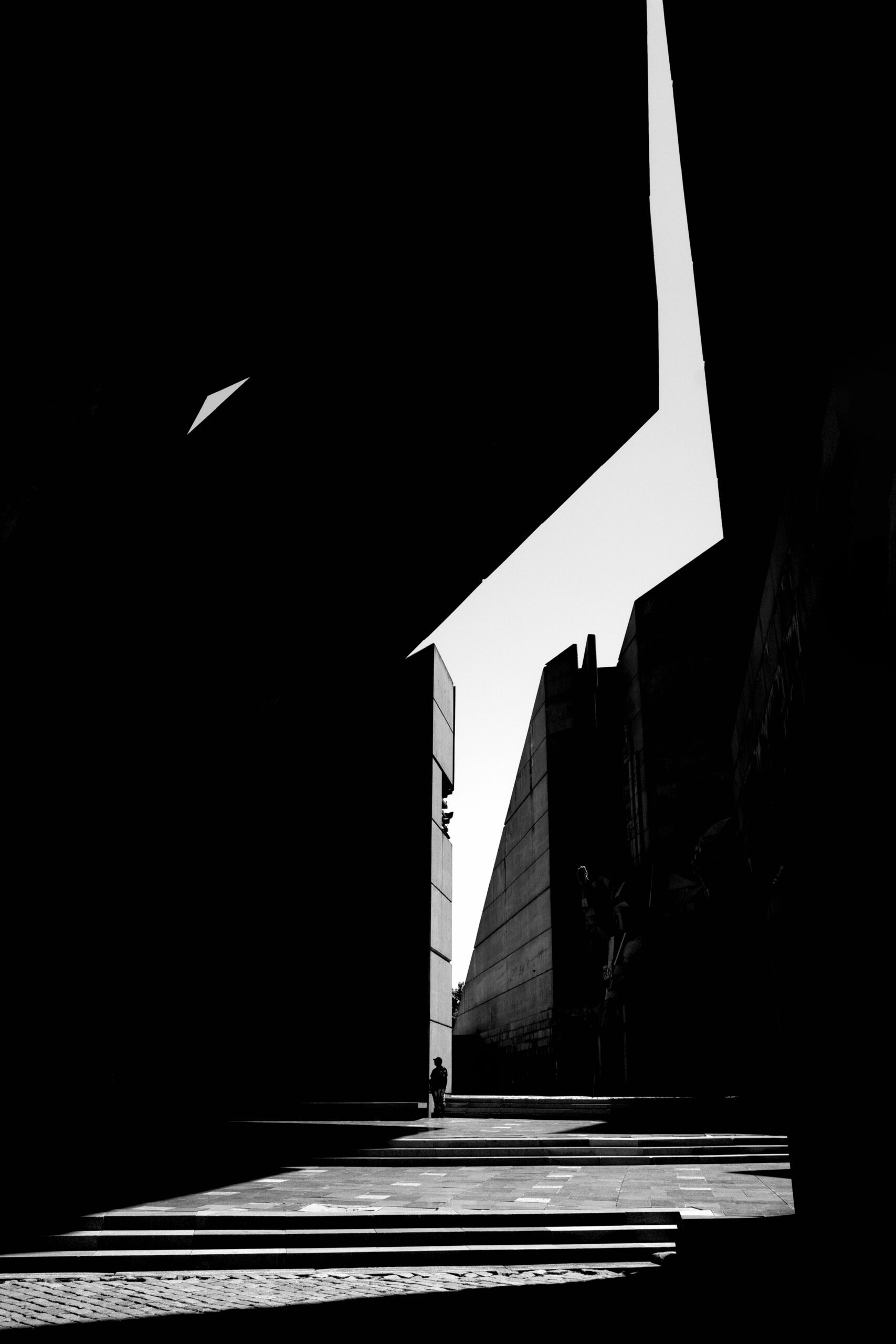 Архитектурна артистична фотография. Високият контраст акцентира върху светлината, формите и геометрията, а незабележимото човешко присъствие придава усещането за мащаб.