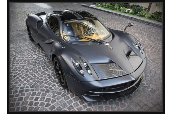 Суперспортен автомобил Pagani Huayra Roadster в матово черно покритие. Снимката подчертава изключителния дизайн, динамичните линии и луксозните детайли на модела върху павирана улица.