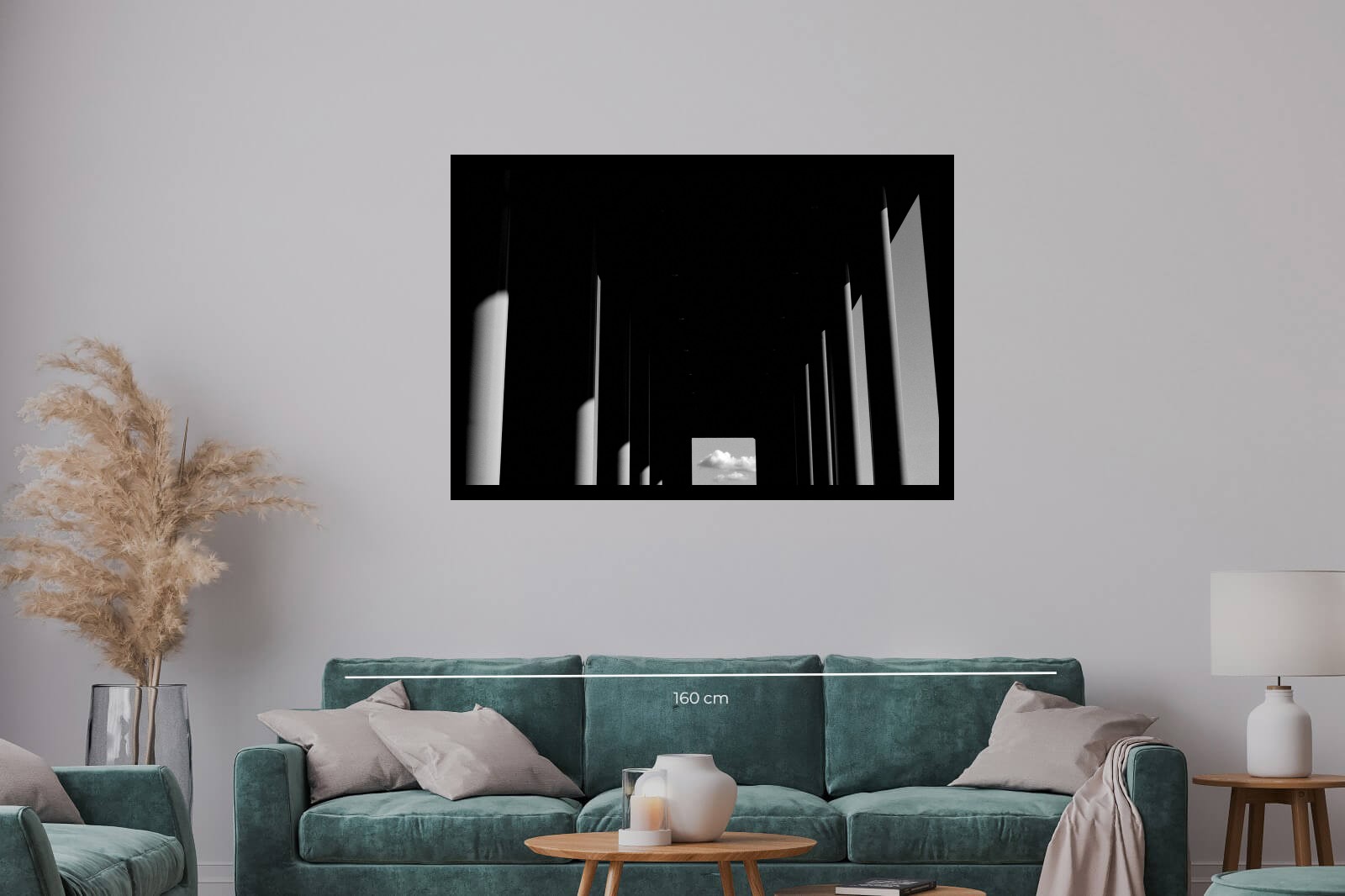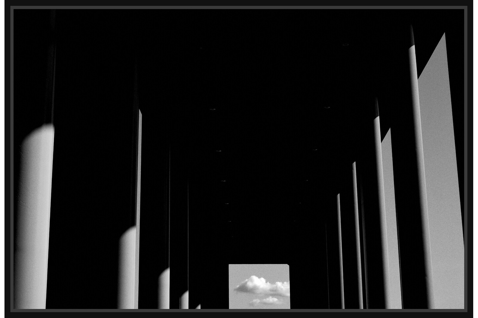 Кадър, който превръща архитектурата в чиста абстракция. Композицията насочва погледа към единствения светъл елемент: малък, идеален квадрат, рамкиращ фрагмент от небе с облаци. Фотография е метафора за вътрешния лабиринт и копнежа по необятното, съчетаващо геометрична строгост с поетична лекота. Идеална за колекционери, които ценят архитектурната абстракция, играта на светлината и философския подтекст в модерната фотография.