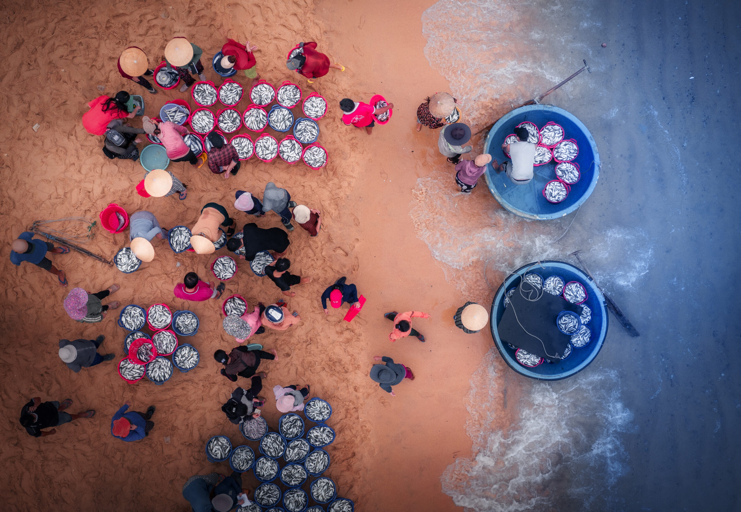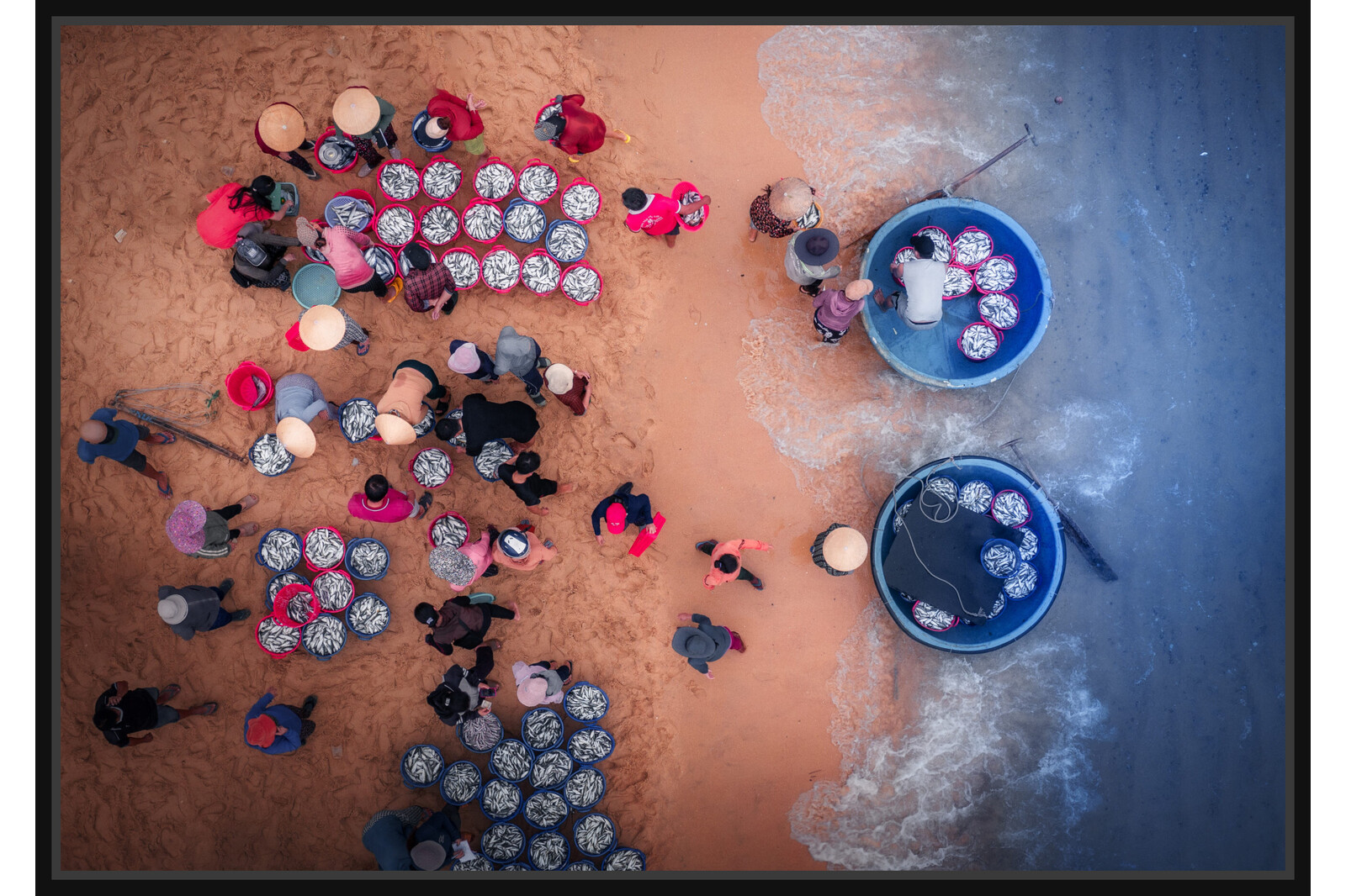 Малки лодки докарват рибата на около 100 метра от брега, а традиционни кръгли лодки, пълни догоре с кофи, пренасят улова до сушата. Мъжете се занимават с риболова, а жените на брега търгуват с улова и събират парите.