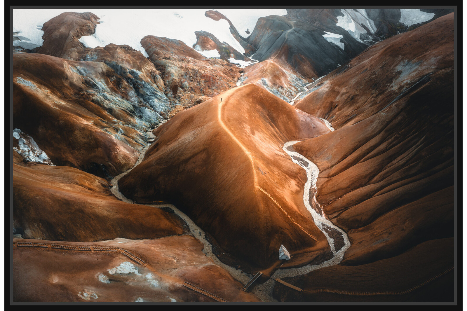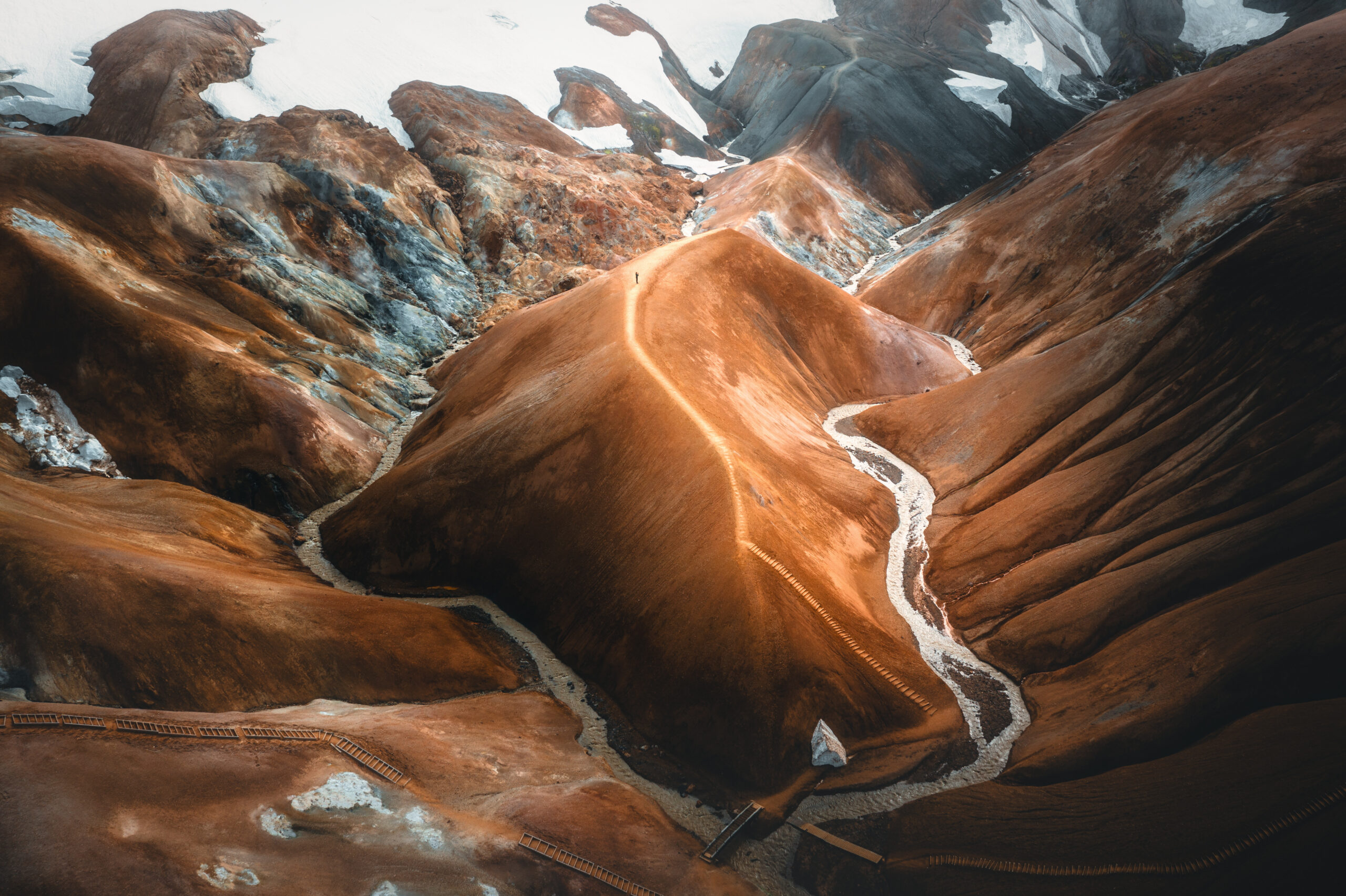 Нереалният свят на Kerlingarfjöll — място, което изглежда като сън, изваян от огън и лед. Тази ярко оранжева планинска верига, оформена от геотермалната активност и времето, без съмнение е един от най-впечатляващите пейзажи, които човек може да види в Исландия. Имахме изключителен късмет с времето. Температурата достигна необичайните за района 21°C — истински подарък за тези ширини — а небето беше изпъстрено с разкъсани облаци, които пречупваха светлината така, че подчертаваха всяка извивка и гънка на хълмовете, обагряйки терена в златисти тонове.