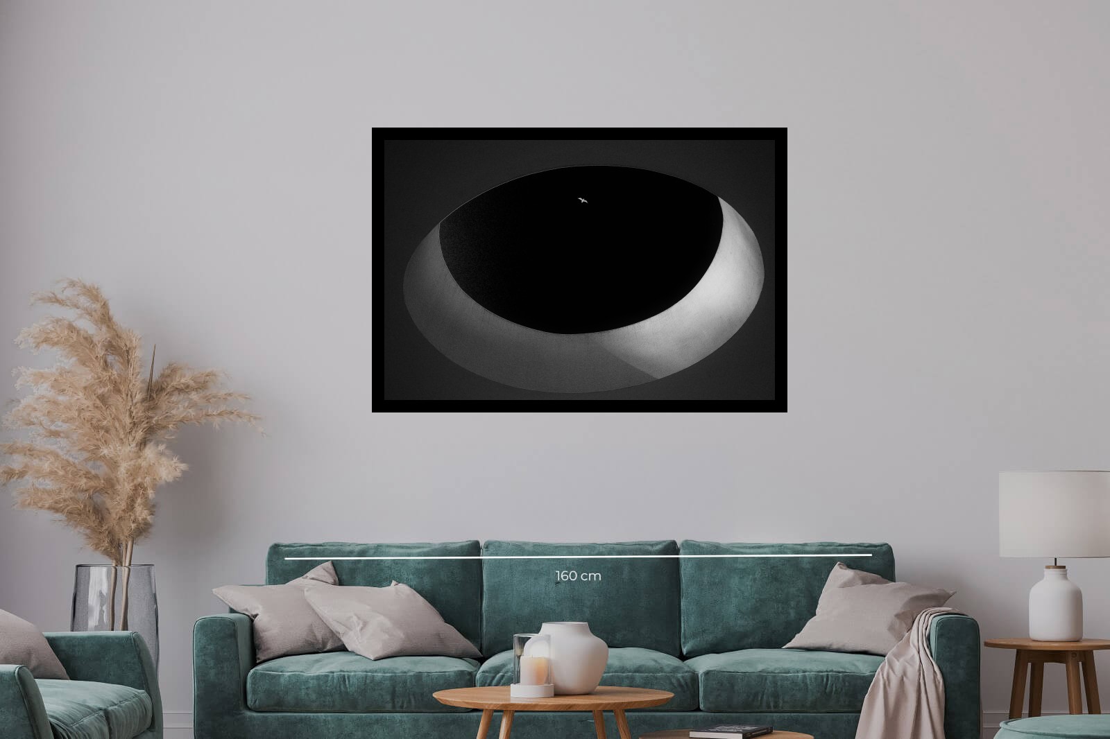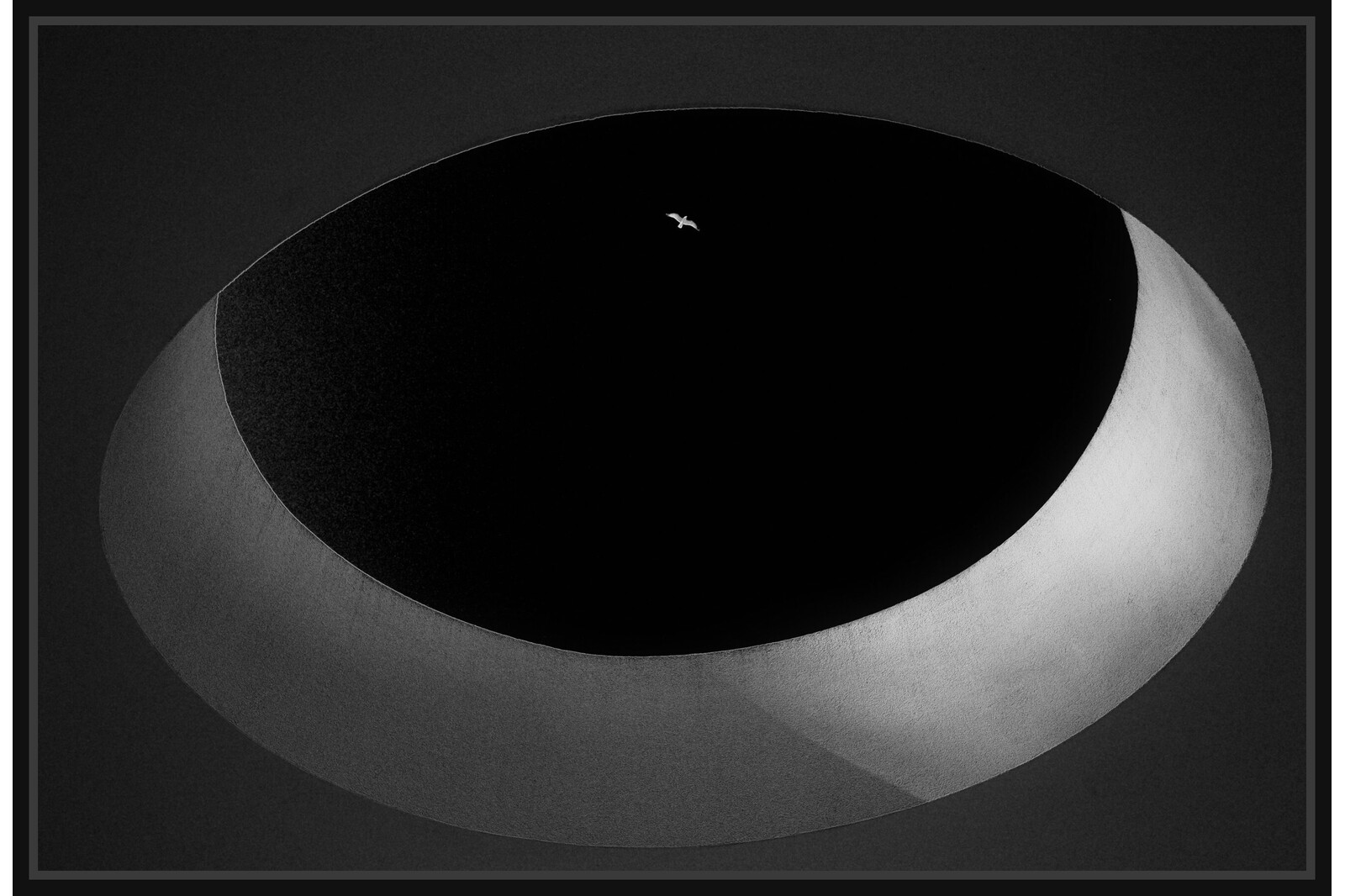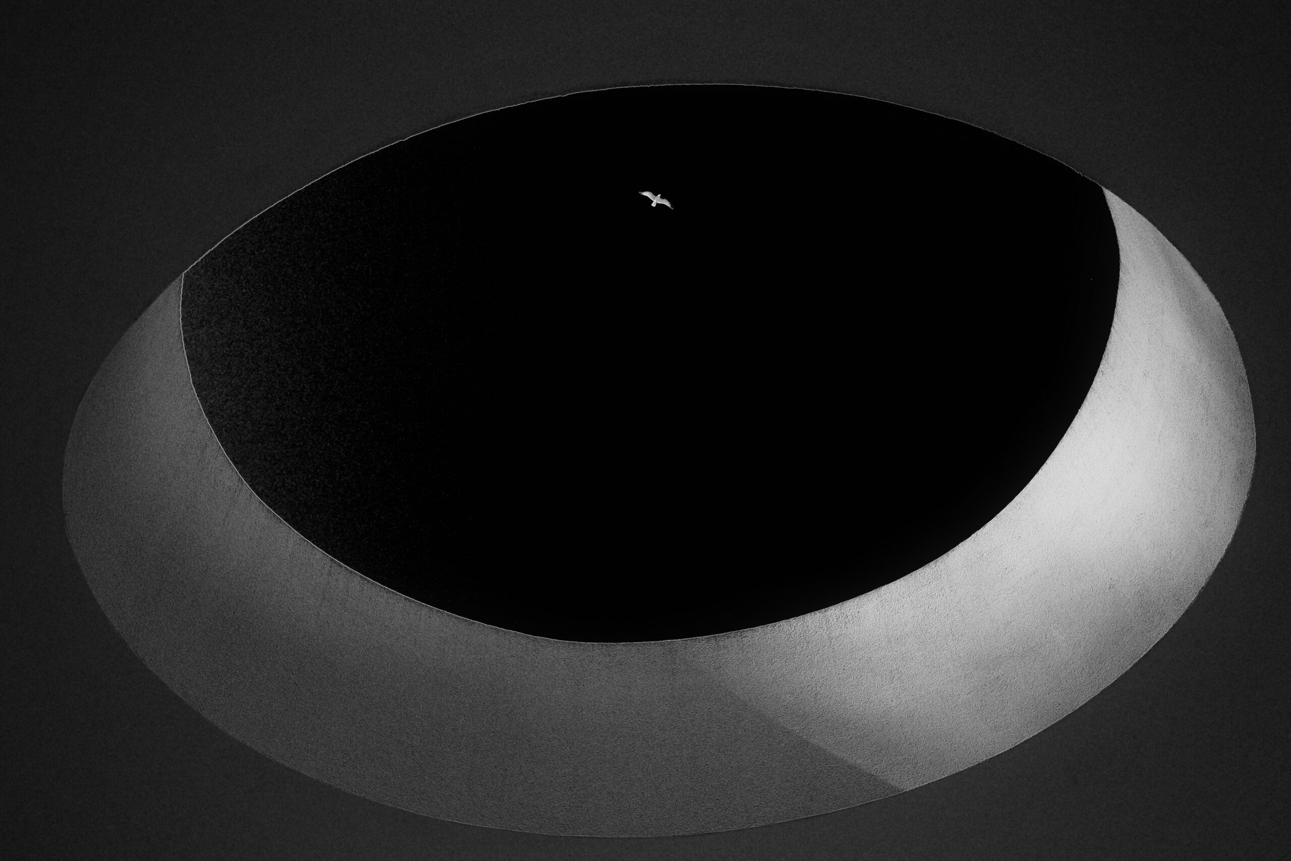 Минималистична абстракция доминирана от елипсовидна форма, която препраща към лунно затъмнение или слънчев часовник. Миниатюрната фигура на птица в горната част стои като стрелка, маркираща момента, или като символ на свободата, изгубена в пространството. Творбата е идеална за колекционери, които ценят чистата, силна графика и философския подтекст в абстрактната фотография.