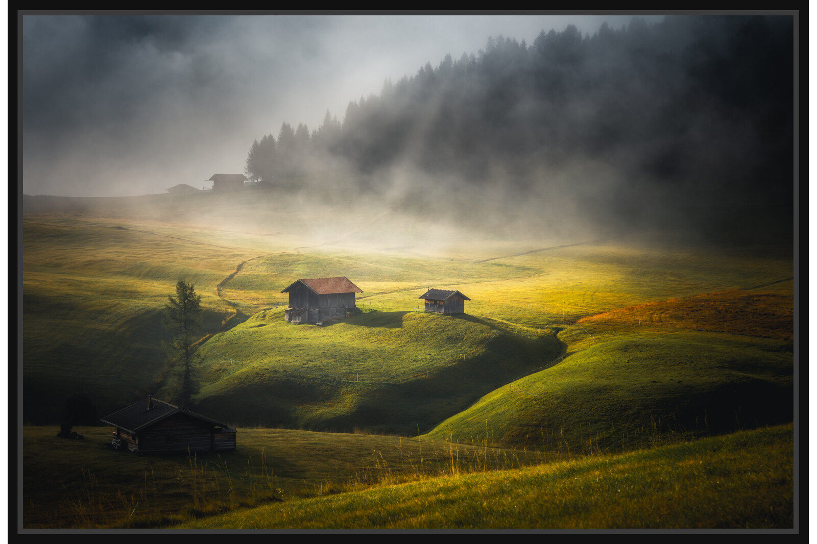 Алпе ди Суизи – най-високото пасище в Европа, където малките дървени барачки се спотайват сред безкрайните зелени склонове. През лятото тук пасат крави и овце, а въздухът е наситен с аромата на билки и свеж планински вятър. Панорамата разкрива величието на Доломитите и спокойствието на живота сред облаците.