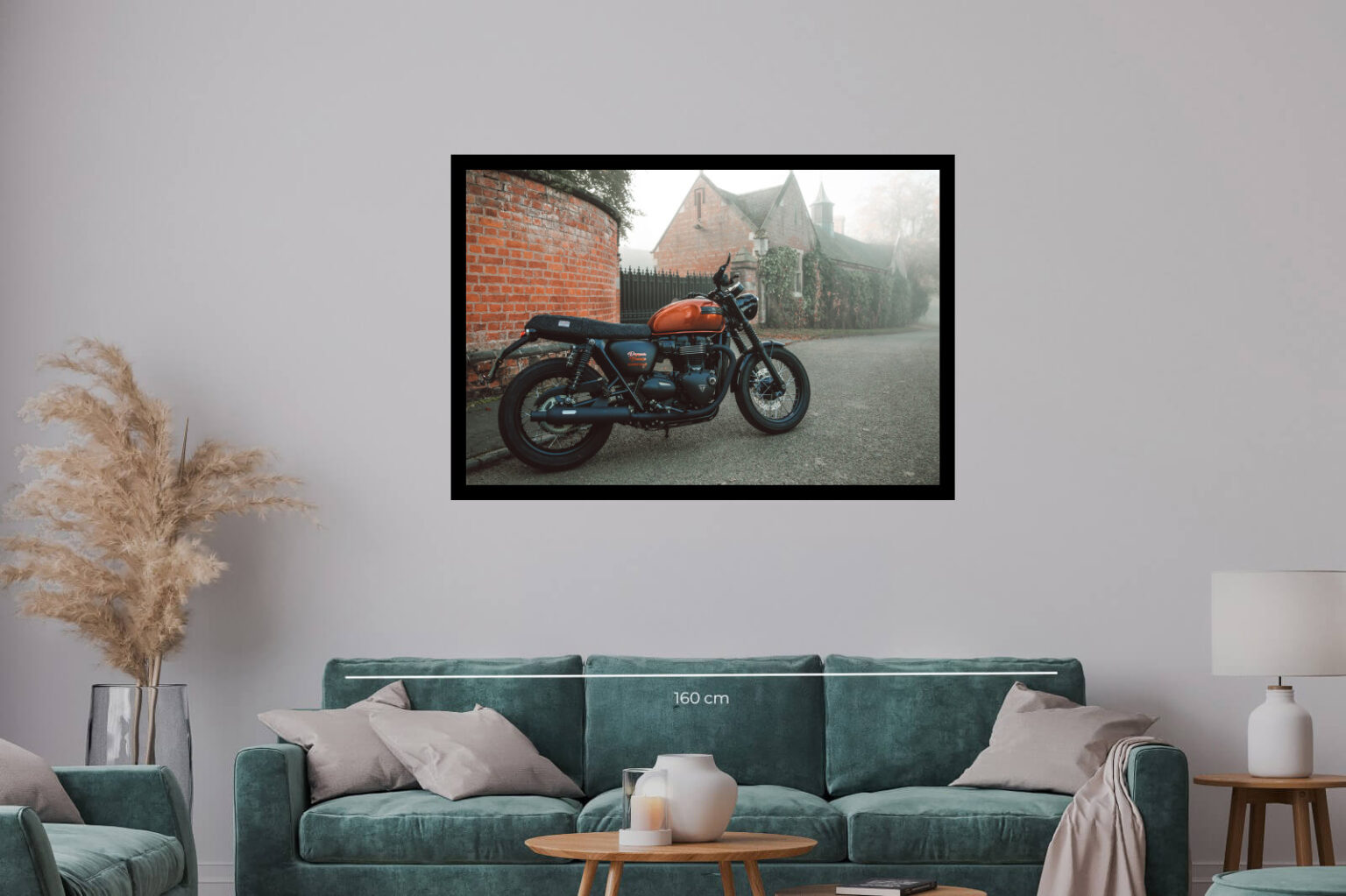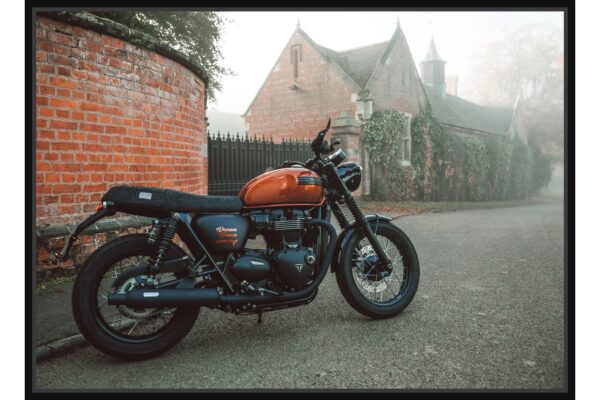 Triumph Bonneville с ретро чар е заснет в мъглива атмосфера пред тухлена стена и стара сграда. Оранжевият резервоар и винтидж дизайнът придават носталгия и елегантност на композицията.