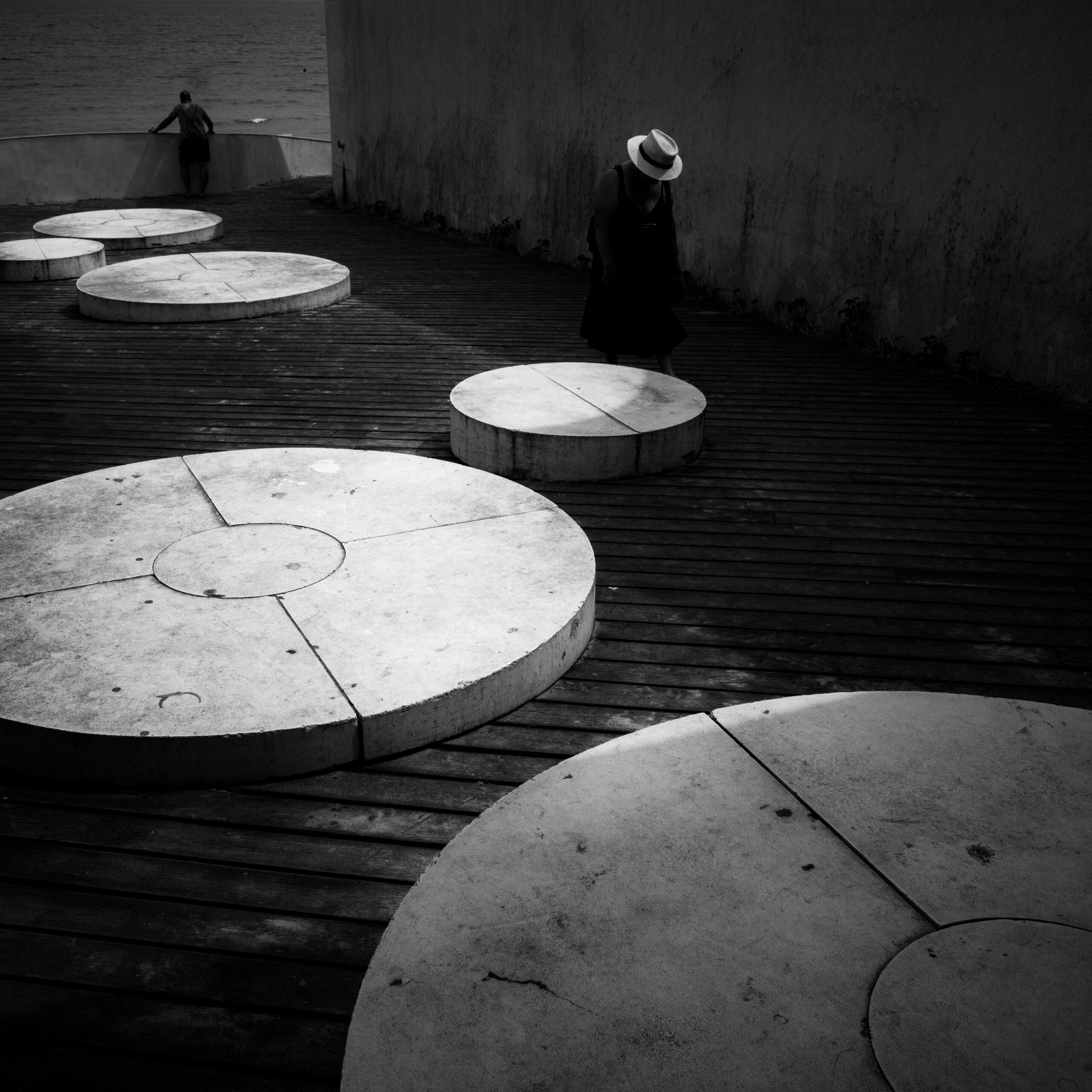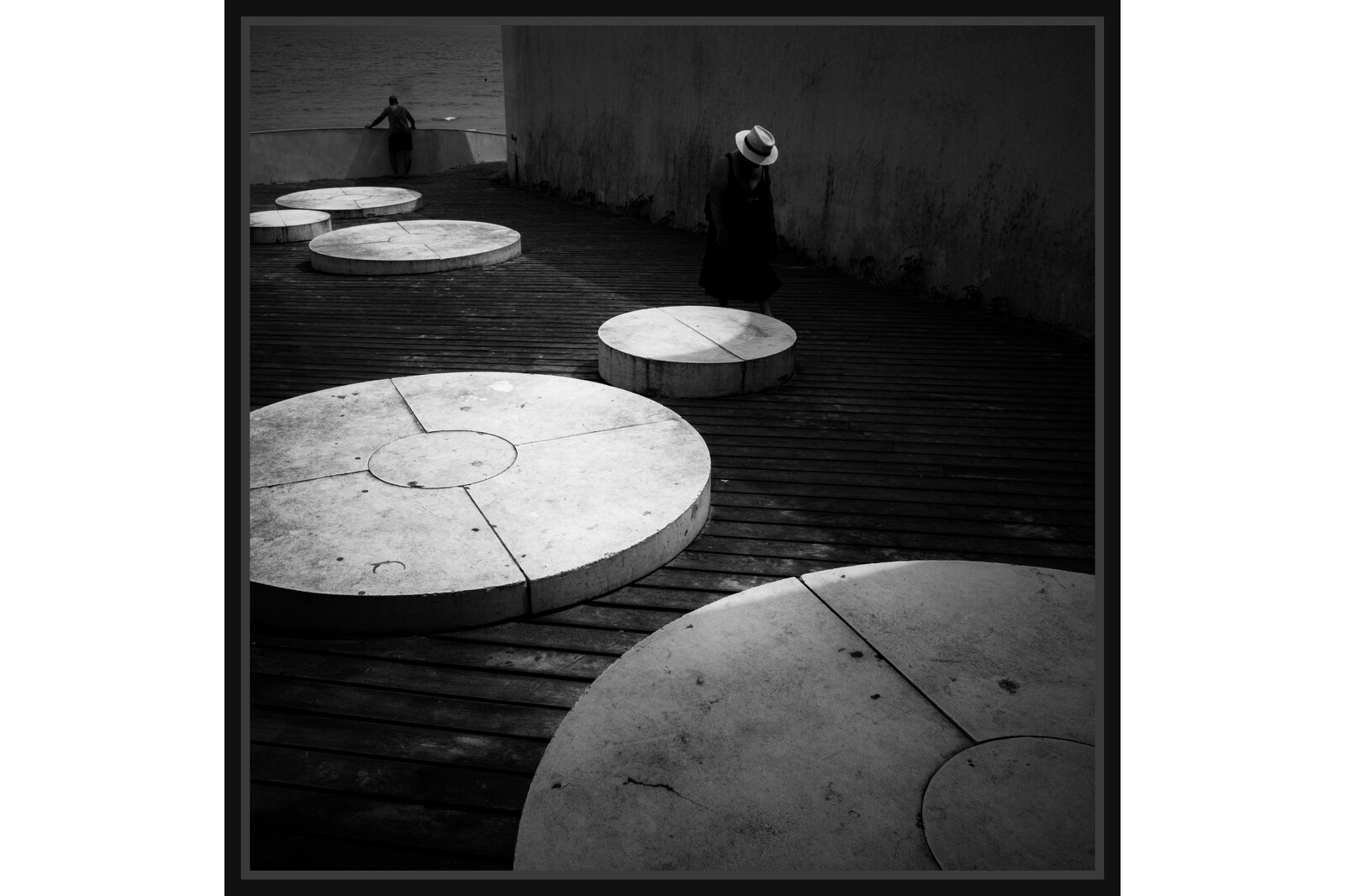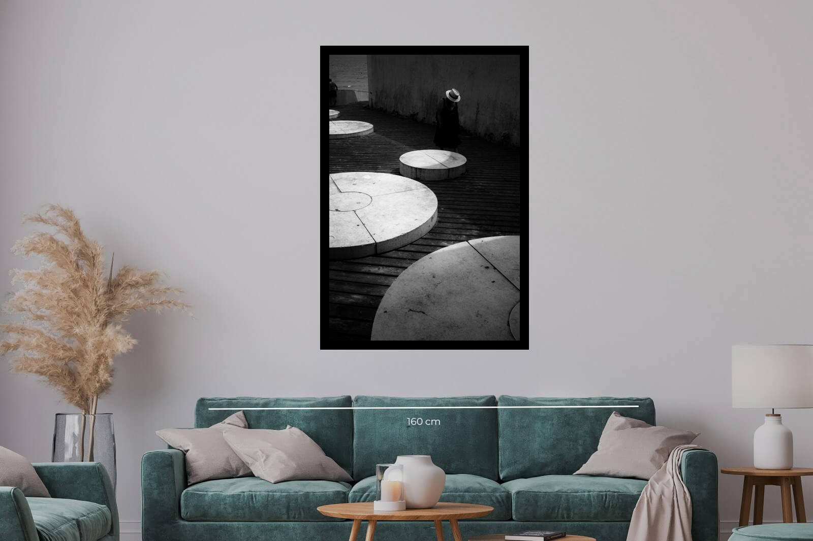 Драматична композиция, която съчетава геометрична строгост с човешка загадка. Кадърът е изграден върху силна диагонална перспектива, подчертана от повтарящи се кръгли форми, които създават усещане за цикъл и безкрайност. Фигурата с шапка, обгърната в сянка, е поставена в центъра на този визуално натоварен път, превръщайки се в анонимен „пътешественик“ във времето. Изследване на паметта, повтаряемостта на събитията. Идеална за ценители на атмосферата, ноар стила и композицията.
